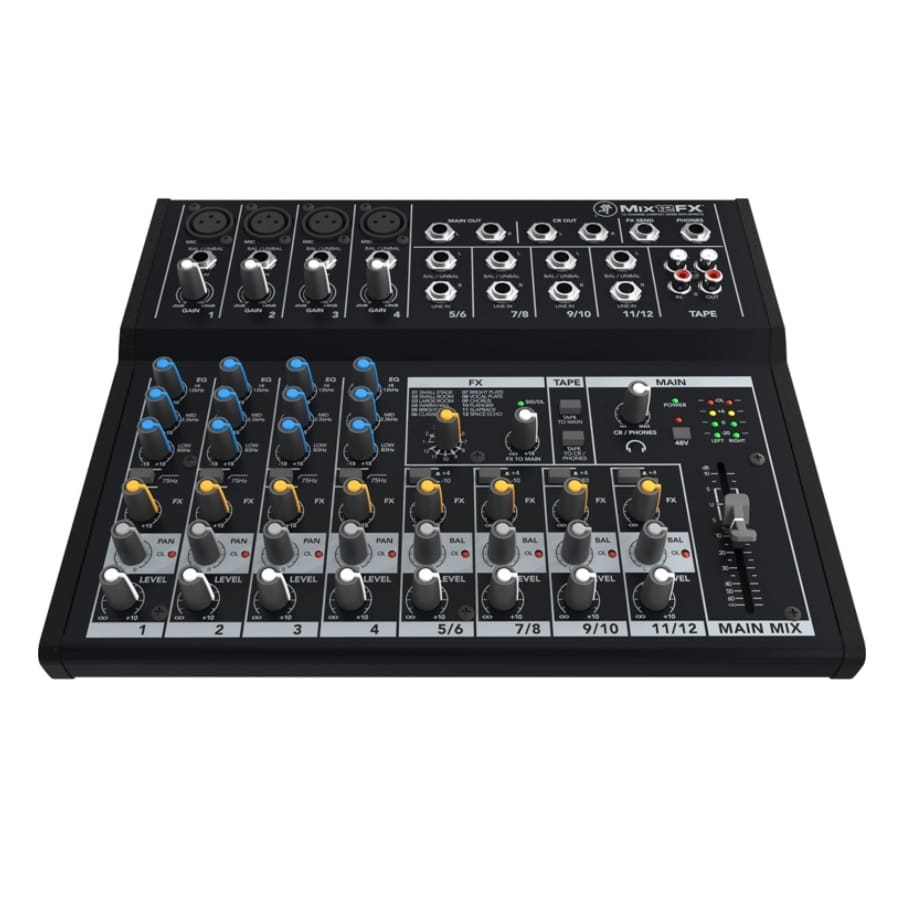 De Mix12FX is een geweldig compact mengpaneel met effecten van Mackie. Mackie is een Duits bedrijf wat hoogwaardige audioproducten maakt voor degelijke prijzen. De Mix-serie bestaat uit compacte mengpanelen waarbij het grootste verschil tussen de panelen de hoeveelheid kanalen is. Echter is er ook een verschil tussen de standaard panelen en de FX-panelen, omdat deze met extra effecten komen. De Mix12FX heeft twaalf kanalen en twaalf verschillende effecten, waaronder reverb, chorus en delay. Het paneel heeft vier microfoonaansluitingen, 3-band EQ, vier stereo 1/4" line inputs, L/R-outputs en een hoofdtelefoonaansluiting. Het paneel zorgt ook voor veel hoofdruimte en weinig ruis. Kortom, de Mix12FX is het ideale paneel voor de veelzijdige muzikant!