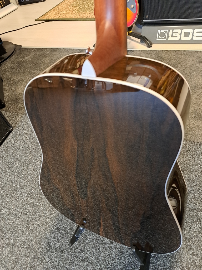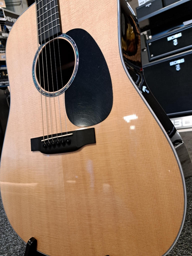 De D-13E is één van de dreadnoughts van de Road Series. Dreadnoughts zijn zeer populair, ze zijn enorm veelzijdig en produceren een heel vol en rijk geluid. Het zijn de ideale slaggitaren, echter klinkt fingerstyle picking op een dreadnought ook geweldig. Bovendien moet u voor een dreadnought echt bij Martin zijn, gezien ze de dreadnought hebben uitgevonden en één van de beste zijn qua ontwikkeling. De D-13E heeft een bovenblad van sparrenhout. Sparrenhout heeft een geweldige resonantie en produceert een mooi warm geluid. De achter- en zijkanten zijn van ziricote gemaakt. Ziricote heeft een goede resonantie die een goede sustain produceert. Het geluid van een ziricote gitaar is scherp en duidelijk, wat het een geweldige fingerpicking gitaar maakt. Verder is het uiterlijk van ziricote ook een voordeel. De diepe donkere kleur staat prachtig met het sparrenhouten bovenblad en de witte binding. De hals is gemaakt van ‘select hardwood’, dit betekend dat de hals van cederhout of van mahoniehout wordt gemaakt, afhankelijk van welke houtsoort Martin geleverd kan krijgen zonder te hoeven participeren in ontbossing. Beide houtsoorten werken prima als hals, en het verschil tussen de twee is minimaal. De toets is gemaakt van richlite. Richlite bestaat uit een combinatie van houtsnippers en resin. Dit creëert een soort kunststof, echter wordt dat niet duidelijk uit de speelervaring, een richlite toets voelt net zo aan als een mahonie of rosewood toets. Zodoende is een richlite toets dus beter, want er hoeft geen onderhoud aan gepleegd te worden en het is beter voor het milieu. Kortom, een prachtige gitaar, esthetisch en muzikaal!