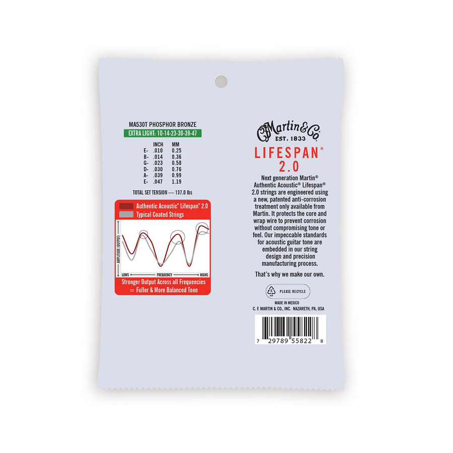De MA530T zijn stevige snaren van het merk Martin. Martin is een Amerikaans gitaarmerk dat al bijna twee eeuwen bestaat. Naast geweldige gitaren produceren ze ook snaren. Deze snaren zijn van de serie ‘treated’ en zijn gemaakt voor westerngitaren. Dit betekend dat de snaren behandeld zijn waardoor ze niet zullen roesten. Daarnaast worden de kerndraad en de omwikkeling ook beschermd, waardoor de klank hetzelfde zal blijven. Deze snaren zijn redelijk dun, maar worden ook in andere snaardiktes gemaakt.