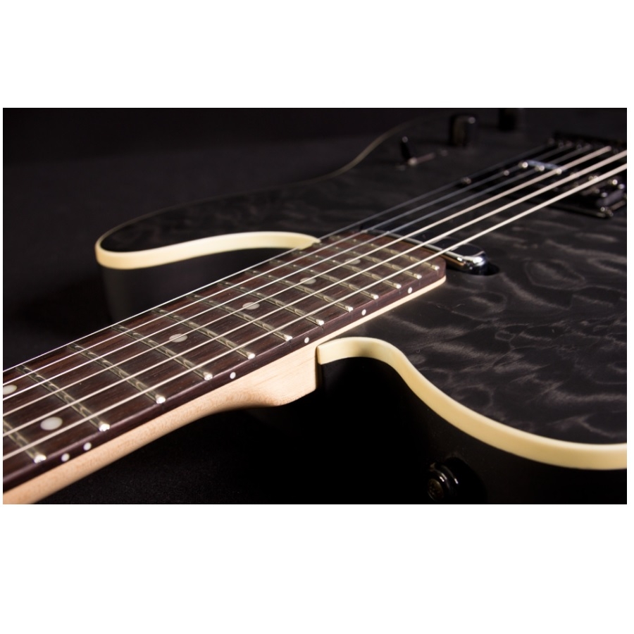 De 1954 Satin Black Wash past perfect in deze mentaliteit. De body en de headstock van de gitaar hebben een bijzonder zwart waterpatroon. Bovendien heeft de gitaar een satijnen afwerking, wat niet alleen voor een comfortabel gevoel zorgt maar het geeft de gitaar ook een professionele uitstraling. De hardware is ook zwart in plaats van metaalkleurig, waardoor de hele gitaar een donkere en stoere uitstraling heeft. De 1954 is duidelijk geïnspireerd op de Telecaster. De vorm van de body is redelijk vergelijkbaar, met kleine aanpassingen. De body is van elzenhout gemaakt en heeft een esdoornhouten bovenblad. Dit zorgt niet alleen voor een geweldig geluid, maar ook voor het prachtige patroon op de bovenkant. De hals is van esdoornhout gemaakt en de toets van ebbenhout. Daarnaast heeft de hals een comfortabele C-vorm. Dit is de populairste halsvorm en wordt over het algemeen beschouwd als de best-spelende vorm. De gitaar heeft dus een fijne speelervaring en een uniek uiterlijk.