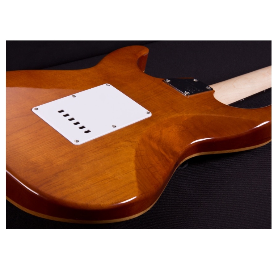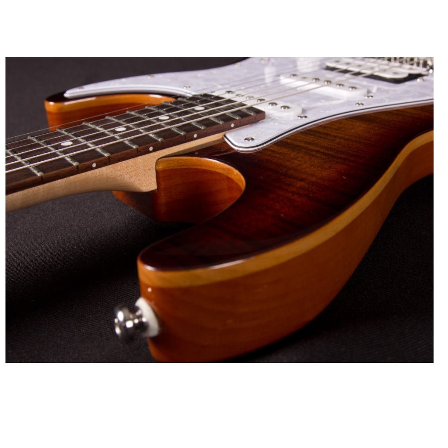Hier valt de 1963 Stratocaster ook onder. Hoewel de kleur van de gitaar klassiek sunburst is, heeft de gitaar ook een uniek patroon. Daarnaast heeft de slagplaat ook een interessante afwerking. Dit model is gebaseerd op de originele Fender Stratocaster, zodat de gitaar een echte Rock ’n Roll uitstraling heeft. De body van de gitaar is van elzenhout gemaakt, wat voor een mooie balans zorgt. De hals is van esdoornhout gemaakt en de toets van ebbenhout, dit zijn klassieke toonhoutsoorten die een uitstekende speelervaring hebben. Hoewel de gitaar gebaseerd is op de jaren ’60, heeft de hals wel een moderne C-vorm, waardoor deze comfortabeler speelt. Bovendien heeft de gitaar ook interessante elementen. Meestal hebben Stratocasters drie single-coil elementen, echter heeft dit model twee single-coil elementen en een humbucker element. Dit zorgt voor een veelzijdigere gitaar, want beide hebben verschillende klankmogelijkheden. Zo is het bijvoorbeeld mogelijk om heel mooi clean te spelen en hard te kunnen rocken met vervorming. Kortom, een zeer opvallende en prachtige gitaar voor een fijne prijs!