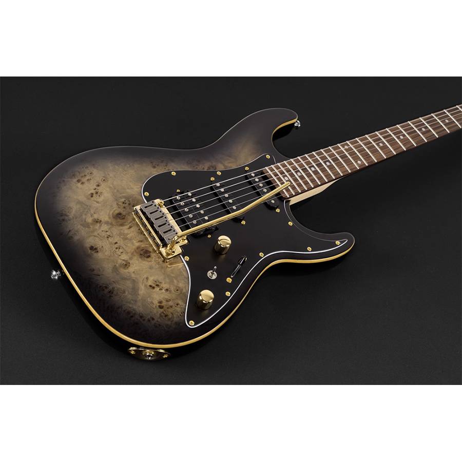 De Michael Kelly Custom Collection 60 Black Burl is een ware schoonheid met een prachtige sound. Geïnspireerd door de gitaren van de jaren 60, de Black Burl brengt oud en nieuw bij elkaar met een vintage Stratocaster body en een prachtige moderne kleur. Een ding is zeker: dit is een opvallende gitaar. Maar niet alleen in de looks valt hij op, ook de klank is uitstekend. Met twee single coils en één humbucker van het bekende merk Rockfield is dit een veelzijdig gitaar waar u vele soorten muziekgenres op kunt spelen. Deze gitaar heeft echter extra mogelijkheden; de meeste gitaren met drie elementen hebben een vijfstandenschakelaar, waarmee er vijf verschillende configuratiemogelijkheden zijn. Deze gitaar heeft een extra mini-schakelaar waarmee het halselement op meerdere mogelijkheden te gebruiken is. Bovendien is de humbucker een split-coil element. Dit betekent dat als de volumeknop omhoog getrokken wordt het element in een single coil, of een enkelspoelelement, wordt. Zodoende heeft deze gitaar elf verschillende elementconfiguraties, waardoor het een zeer veelzijdige gitaar is.
