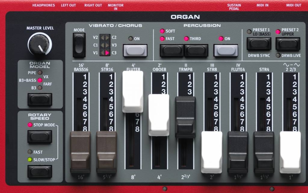 De orgelsectie is erg uitgebreid en heeft veel meegekregen van het topmodel van Nord op orgelgebied, de Nord C2D. Zo is bijvoorbeeld een klanksimulatie van een Leslie 122 beschikbaar. Het keyboard beschikt over fysieke drawbars en een B3 bastoonwiel. Er is een mount beschikbaar waardoor de Half Moon Switch bevestigd kan worden om vervolgens gebruik te kunnen maken van Rotary Speaker Control.