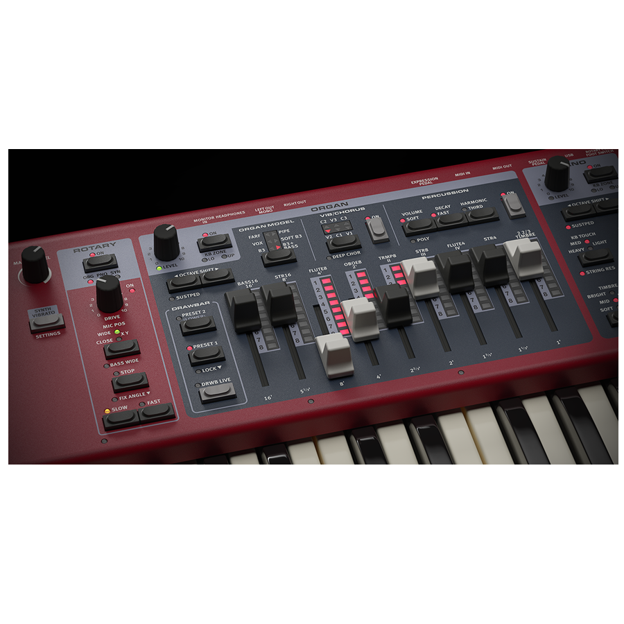 De orgelsectie is gebaseerd op de befaamde Nord Organ 3-engine en beschikt over een vernieuwde rotary speaker met instelbare microfoonposities, Slow/Fast- en Stop-functies en verbeterde transistororgelmodellen. Fysieke drawbars met LED-indicatie en Drawbar Live Mode maken het eenvoudig om te schakelen tussen Upper- en Lower-manual instellingen en presets.