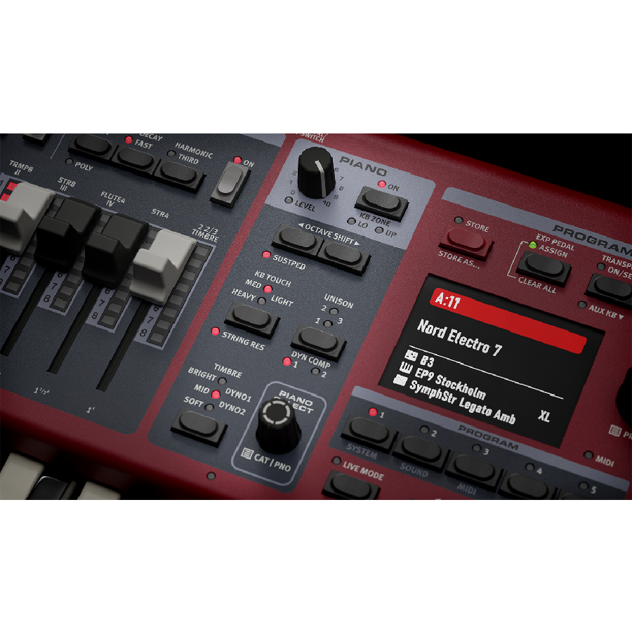 Nieuw in de Nord Electro 7 is de uitgebreide synthsectie met sample-playback, analoge en FM-synthese. Functies zoals Mono/Legato, Glide, Unison, ADR-envelopes, resonantiefilter, FM-partials en synth-vibrato bieden een breed scala aan moderne en klassieke synthklanken.