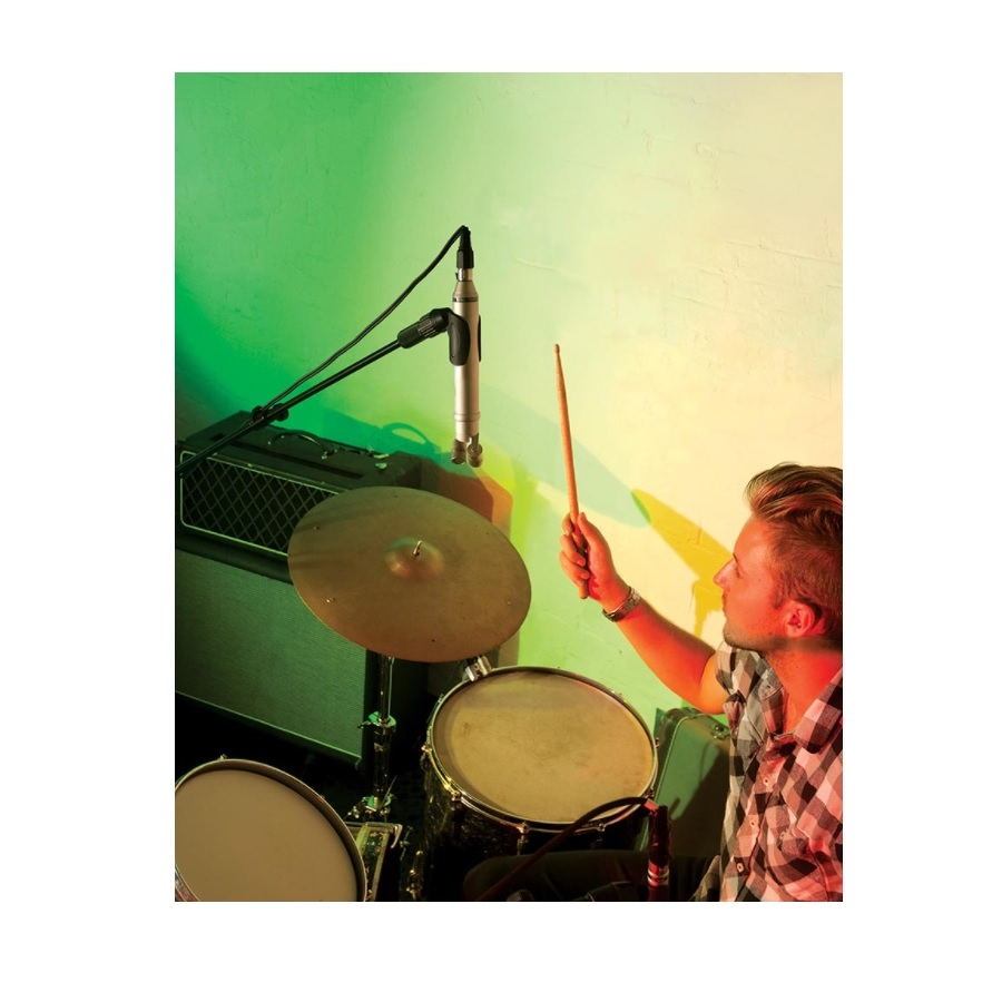 De NT4 is een geweldige studiomicrofoon van Røde. Røde is een Australisch bedrijf wat professionele audioproducten maakt. Hun producten zijn in veel professionele studio’s te vinden. De NT4 is een stereo condensatormicrofoon. Deze microfoon is Røde’s oplossing voor een enkele microfoon die een dubbele microfoon nabootst. Dit is dus de ideale keuze voor de muzikant die een ‘matched pair’ uit één microfoon wilt halen. Het is met de NT4 dus ook niet nodig om allerlei statieven aan te schaffen en de richtingen moet afstellen om het beste uit de microfoon te kunnen halen. Het is simpelweg mogelijk om de microfoon ergens neer te zetten en hetzelfde effect te creëren. De microfoon heeft een dubbele vergulde membraam en een brede frequentie. Het heeft ook een cardioïde richtingspatroon, waardoor alleen audio uit één richting wordt opgenomen. Dit, gecombineerd met het feit dat de twee capsules 90 graden naar elkaar gedraaid staan, zorgt voor een heldere akoestische opname. De NT4 is vooral populair voor het opnemen van drums, percussie, koren en samenspel. De microfoon wordt geleverd met een koffer, een windkap, twee kabels en een klip. Kortom, de NT4 is een uitstekende aankoop voor elke studio!