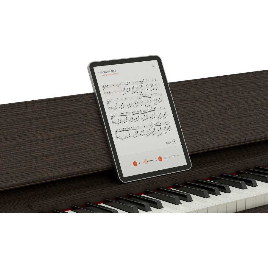 De bediening van de KF-25 is bewust overzichtelijk gehouden, met directe toegang tot de belangrijkste functies en minimale afleiding tijdens het spelen. Via Bluetooth kan de piano draadloos worden verbonden met een smartphone of tablet, waardoor koppeling met oefen- en bedieningsapps eenvoudig is. Met de bijbehorende app zijn extra klanken beschikbaar en kunnen instellingen nauwkeurig worden aangepast, wat extra flexibiliteit biedt zonder de speelervaring te onderbreken.