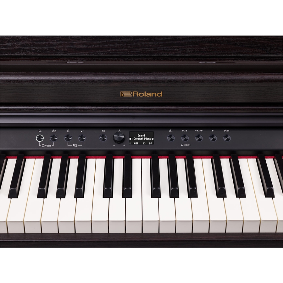 Het eerste wat opvalt aan de RP701 is de bijzonder mooie kast. Het is al snel duidelijk dat Roland dit ontwerp erg heeft afgeleid van de duurdere HP en LX modellen. De moderne rechte lijnen aan de zijkanten van de kast, in combinatie met de rond afgewerkte voorpoten maken de RP701 een compleet plaatje. Ook de kleuren hebben een update gekregen met keuzes uit, zwart, wit, licht eiken en zelfs palissander! Als u dichtbij de piano komt ziet u al snel hoe netjes de afwerking is gedaan. Met een mooie houten afwerking waar de nerven goed zichtbaar zijn, is dit zeker een prachtig meubel voor in de woonkamer!