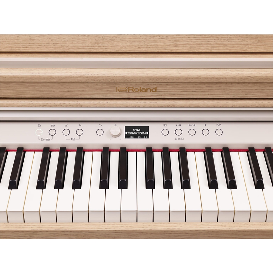 Het eerste wat opvalt aan de RP701 is de bijzonder mooie kast. Het is al snel duidelijk dat Roland dit ontwerp erg heeft afgeleid van de duurdere HP en LX modellen. De moderne rechte lijnen aan de zijkanten van de kast, in combinatie met de rond afgewerkte voorpoten maken de RP701 een compleet plaatje. Ook de kleuren hebben een update gekregen met keuzes uit, zwart, wit, licht eiken en zelfs palissander! Als u dichtbij de piano komt ziet u al snel hoe netjes de afwerking is gedaan. Met een mooie houten afwerking waar de nerven goed zichtbaar zijn, is dit zeker een prachtig meubel voor in de woonkamer!