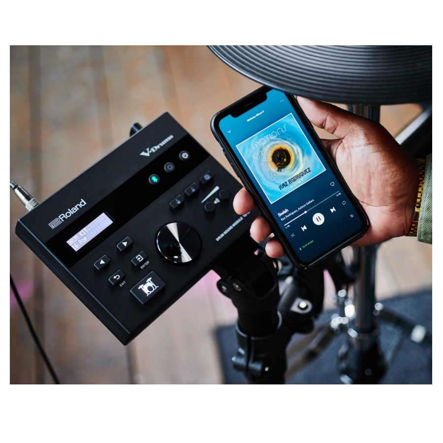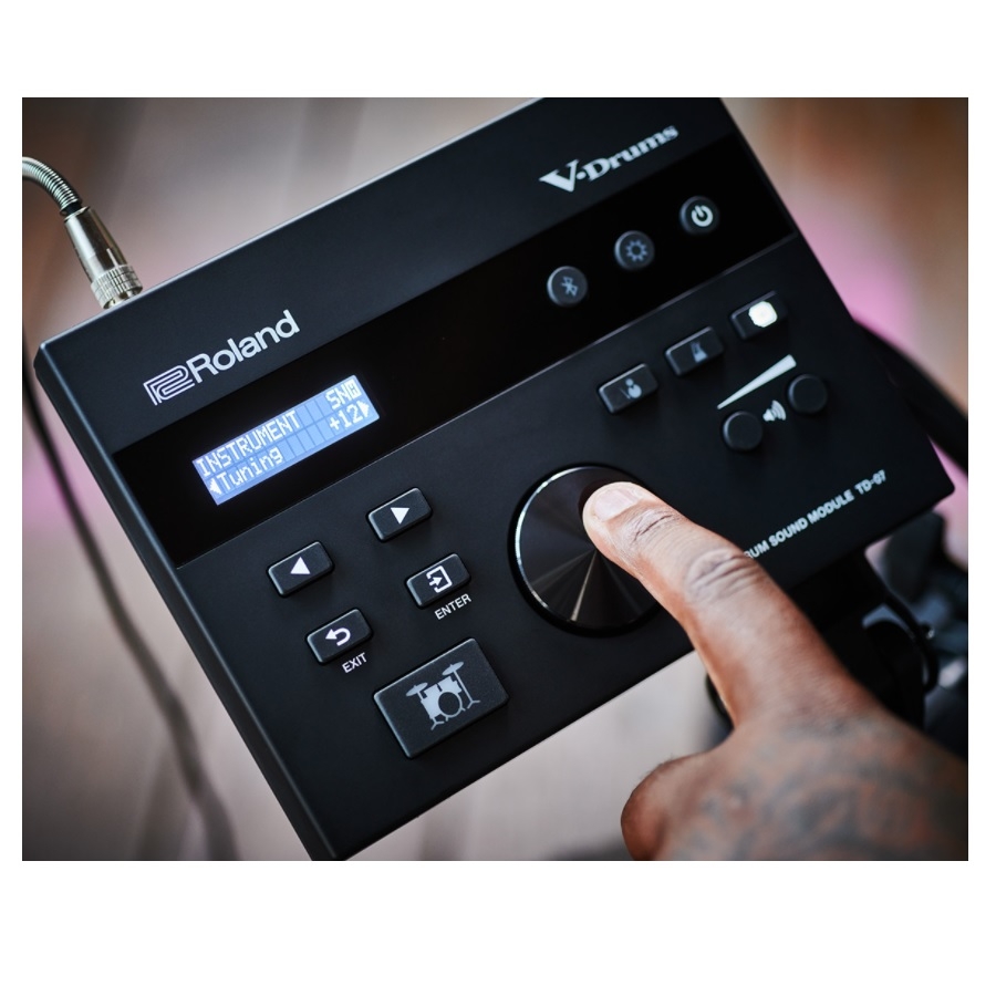 De set komt met de TD-07 module, zoals elke set in de serie. Deze module is erg krachtig. Het bevat een enorme lijst aan klankmogelijkheden, van akoestische drumstellen tot verschillende soorten percussie. Alle klankmogelijkheden zijn door professionele muzikanten in goede studio’s opgenomen, voor een zo authentiek mogelijke klank. Bovendien zijn de klanken te mixen, waardoor er ook vele unieke mogelijkheden zijn. De module heeft ook door hoe u speelt, zodat het geluid daar op wordt aangepast. Als u dus zacht slaat, aan de zijkant van een tom of cymbaal, of juist heel hard, het geluid wordt hier op aangepast. Het geluid is ook aan te passen aan omgeving en situatie. Bij een akoestische set kan het geluid anders klinken afhankelijk van demping, echo, resonantie en ruimte. U kunt dus verschillende ruimtes instellen op elke klankmogelijkheid, zodat deze uw echte omgeving weerspiegelt. De module heeft ook een Bluetooth-functie, waardoor u erg makkelijk met uw favoriete muziek mee kunt spelen.