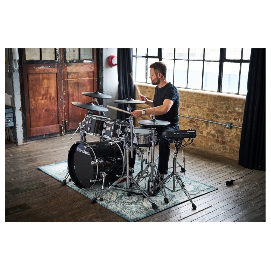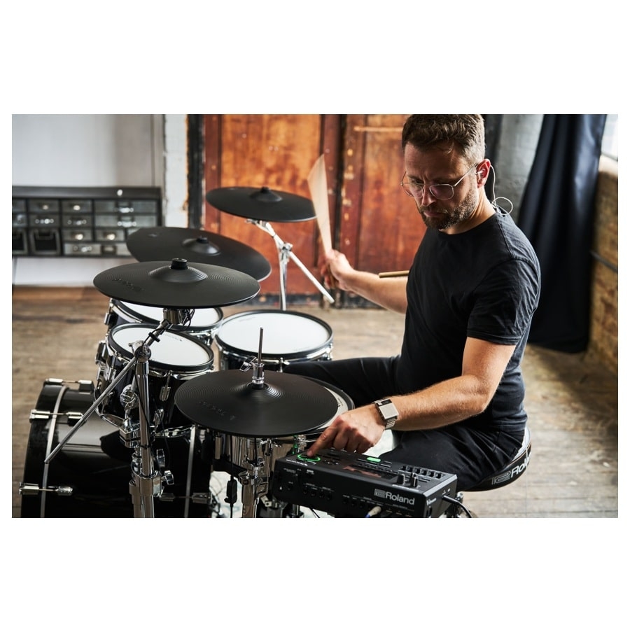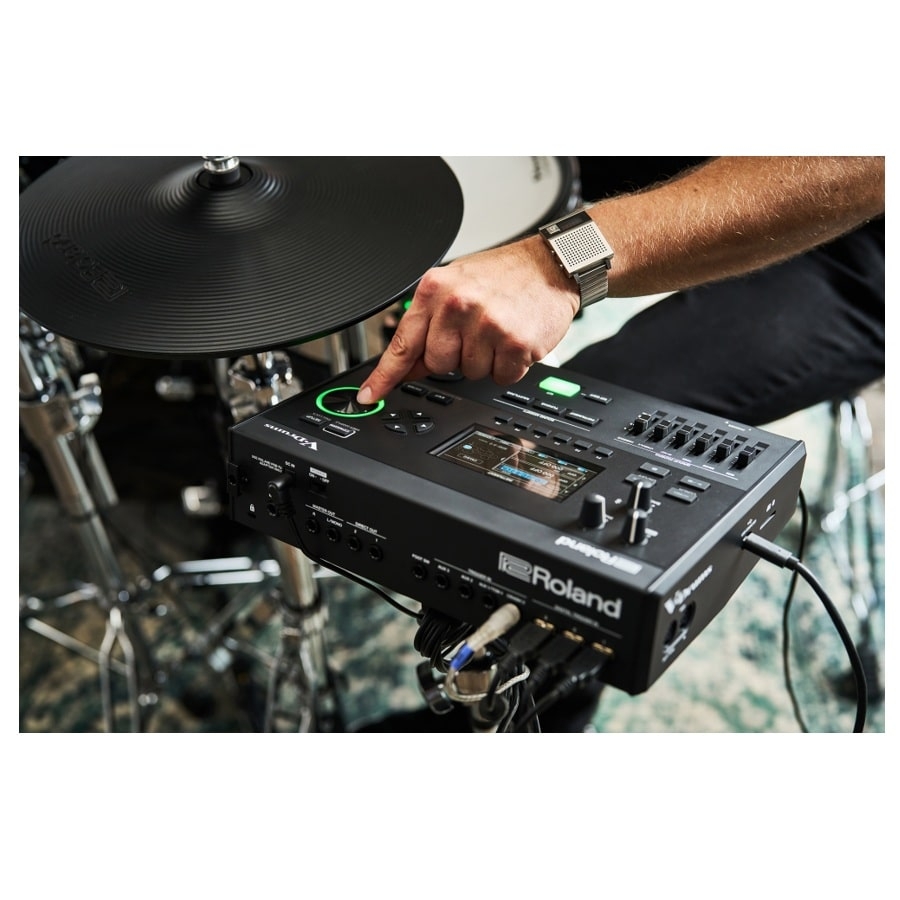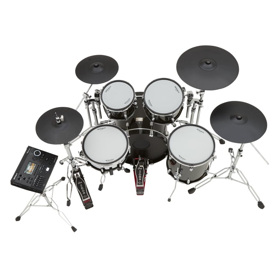 Met de V-Drum 5 Serie worden Roland’s zeer populaire digitale drumstellen naar een nog hoger niveau getild. De drumstellen in de serie bevatten een nieuwe en verbeterde sound module, nóg gevoeligere pads en authentiekere geluiden. U kunt nu ook uw smartphone draadloos op de V51 module aansluiten, waardoor u met de Roland Cloud Connect direct uw sound en de kits kan aanpassen. Dit betekent ook dat u altijd toegang hebt tot de constant groeiende bibliotheek van Roland, met instrument expansies en nieuwe kits. De bibliotheek bevat al zeer realistische opnames van ’s werelds beste drumstellen waardoor ze een ongekend authentiek en gedetailleerd geluid kunnen producen. Deze geweldige drumstellen zijn opgenomen in een 32-bit/192 kHz resolutie in de beste opnamestudio’s over de hele wereld. U kunt natuurlijk ook uw eigen geluiden aan uw bibliotheek toevoegen. Daarnaast kunt u via de MIDI-aansluiting de module direct op uw DAW aansluiten en direct uw spel op kunt nemen. De V51 heeft ook handige nieuwe functies: de Phrase Trainer (loops voor het oefenen van ritmes), Stroke Monitor (navigeert hoe u uw stokken gebruikt), en Blast Beat Trainer (waarmee u uw tempo en uithoudingsvermogen kan trainen). De digitale snare pad en hi-hat pad kunnen nu ook apart worden aangesloten (USB) waardoor deze nog realistischer en expressiever klinken.