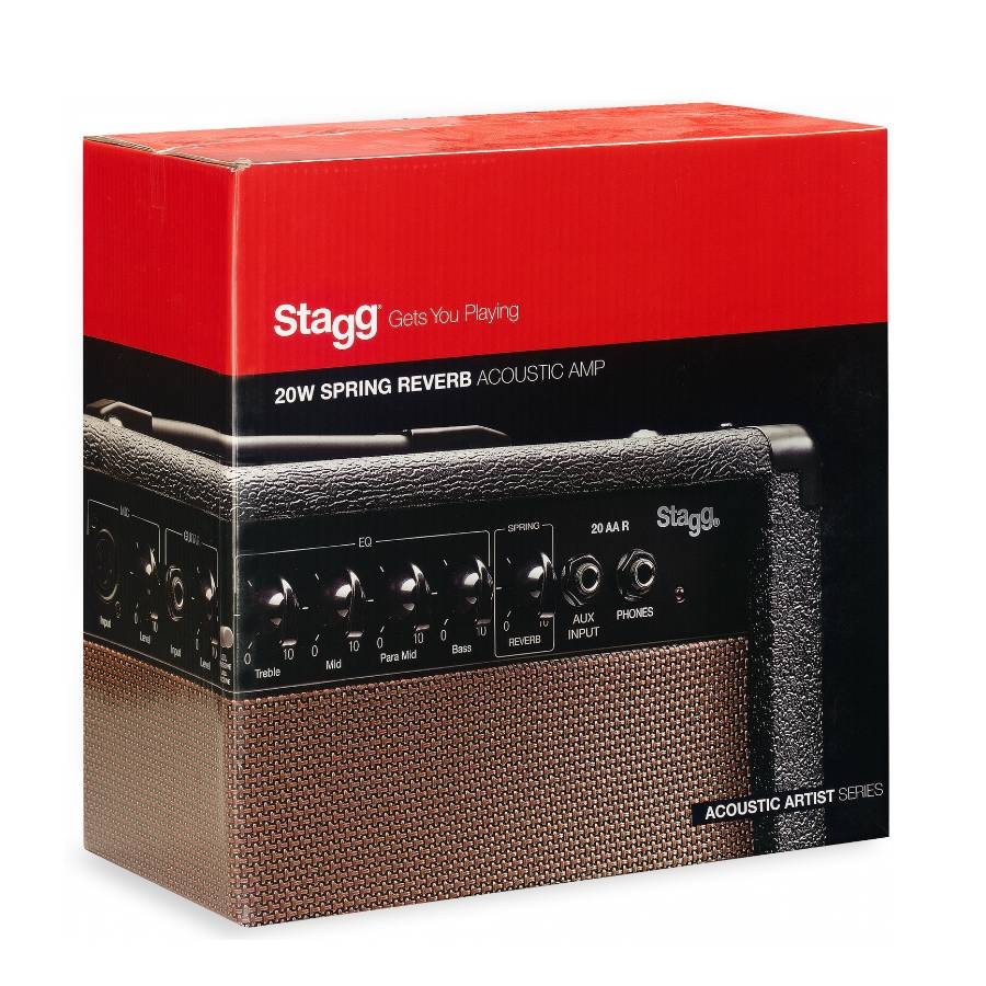 De Stagg 20AAR is het derde model uit een serie zeer betaalbare akoestische gitaarversterkers. In tegenstelling tot de twee kleinste modellen beschikt dit model over twee kanalen, waardoor er tegelijkertijd een gitaar en een microfoon kan worden aangesloten. Dit maakt de versterker ideaal bruikbaar voor singer/songwriters die zichzelf begeleiden op de gitaar. De versterker heeft een verzorgde zwarte speakerkast met een chique vintage speakerdoek. Deze combinatie zorgt voor een fraaie uitstraling.