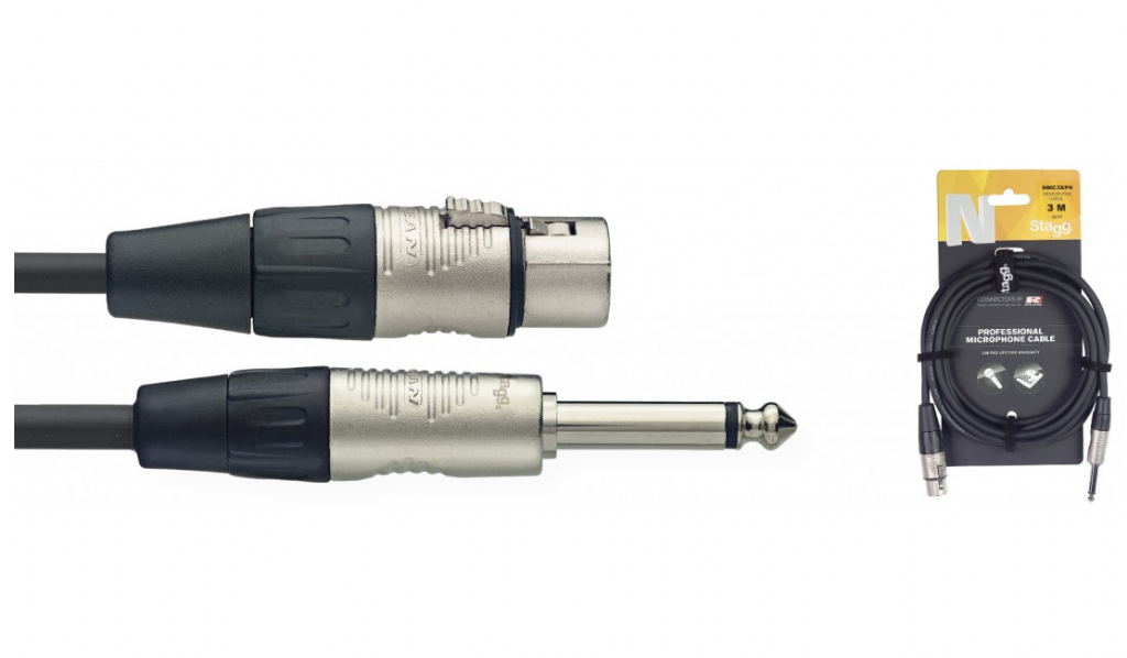 De Stagg NMC3XPR is een professionele microfoonkabel van goede kwaliteit. De kabel is uitgevoerd met een vrouwelijke XLR-plug en een mono jackplug. De pluggen zijn Rean connectoren. Rean is een dochterbedrijf van Neutrik, één van de marktleiders op het gebied van connectoren. Doordat Stagg gebruikt maakt van deze stevige en kwalitatieve pluggen is een lange levensduur gegarandeerd. De vrouwelijke XLR connector is uitgevoerd met een trekontlastingsysteem, hierdoor is het vrijwel onmogelijk dat de kabel losraakt van de aansluiting. Deze kabel wordt vaak gebruikt om een microfoon aan te sluiten op een keyboard of op een eenvoudige audio-installatie.