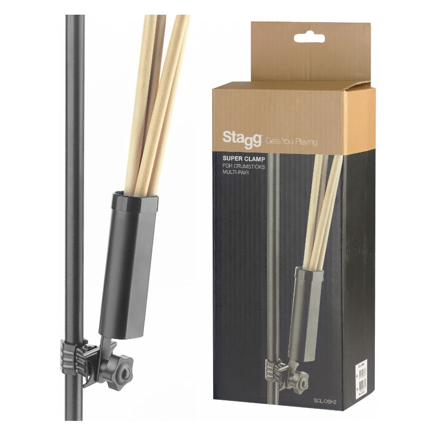 De Stagg SCLDSH2 is een drumstokkenhouder voor drie paar stokken. Middels een stevige bevestigingsklem kan de houder gemakkelijk worden gemonteerd op een bekken, een microfoon of een andere standaard met een buisdiameter tussen de 18 en 45 mm. De klem met schroefsysteem en een rubberen binnenzijde zorgt dat de houder stabiel bevestigd kan worden.