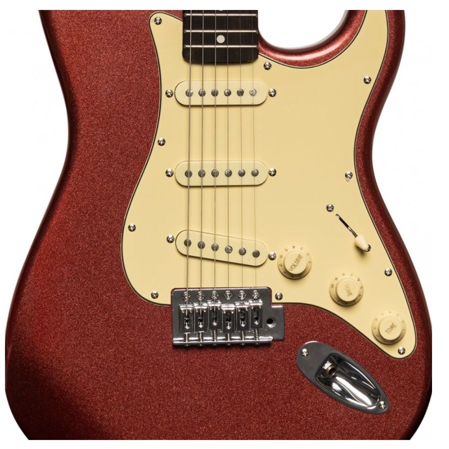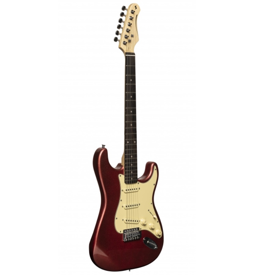 De Stagg SES-30 is een prachtige gitaar. Deze gitaar is gebaseerd op de legendarische Stratocaster. De Stratocaster is bekend geworden door de vele legendarische gitaristen die er op spelen, zoals Jimi Hendrix en David Gilmour. Dit maakt het een perfecte gitaar om aan uw collectie toe te voegen. De donkerrode kleur en de crème accenten geven de gitaar een prachtige uitstraling. De body is gemaakt van massief paulownia hout, en de hals is van esdoornhout gemaakt. Deze soorten hout brengen een geweldige klank met zich mee. Daarnaast heeft de gitaar drie single-coil pick-ups en een vijfstandenschakelaar, waardoor het geluid makkelijk is af te stellen en de gitaar voor elk genre gebruikt kan worden. Deze gitaar is een prachtige aanwinst voor iedere gitarist!