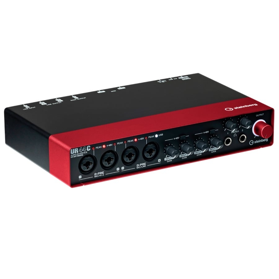 De UR44C is een goede interface van Steinberg. Steinberg is een Duits bedrijf wat hoogwaardige audioproducten produceert. Ze staan voornamelijk bekend om hun opnameprogramma: Cubase. Ze maken echter ook hoge kwaliteit interfaces. De UR44C is een compacte en handige interface. Het apparaatje heeft vier microfoonaansluitingen en vier instrumentaansluitingen, hoewel de microfoonaansluitingen worden gedeeld met de instrumentaansluitingen, waardoor u maar een maximaal van vier inputs tegelijkertijd kan gebruiken. Alle inputs hebben hun eigen volumeknop. De interface heeft een stereo output en een MIDI-in en -out. U kunt ook uw audio beluisteren met een hoofdtelefoon, de interface heeft twee hoofdtelefoonaansluitingen. Bij de UR44C heeft u aparte volumeregelingen voor de hoofdtelefoons en de stereo output. Bovendien heeft de interface twee verschillende stereo line outputs en twee line inputs. U kunt de UR44C op uw computer aansluiten via de meegeleverde USB-kabel. Als uw apparaat niet genoeg fantoomvoeding biedt, kunt u ook een onafhankelijke voedingsbron op uw interface aansluiten. Bovendien komt de interface inclusief Cubase AI en Cubasis LE. Cubase AI is een simpelere versie van de beroemde Cubase Pro en Cubasis LE is specifiek voor het opnemen en mixen op uw IPhone of IPad. Andere inclusieve programma’s zijn dspMixFx en FX Basic Suite. De UR44C produceert hoge kwaliteit audio, met een 32-bit/192 kHz resolutie, en is veelzijdig qua gebruik. Zodoende kunt u muziek opnemen, maar is de interface ook zeer geschikt als audio interface voor visuele media. Dit maakt de interface ook populair onder content creators en podcasters.