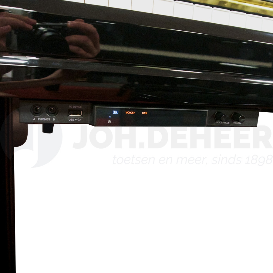 Maar de piano heeft dus meer, namelijk de TransAcoustic technologie. De piano is uitgevoerd met de meest hoogwaardige samples die Yamaha tot hun beschikking heeft zoals onder andere die van de Yamaha CFX-vleugel en de Bosendorfer Imperial vleugel. U kunt door middel van het middelste pedaal de aanraking van de hamers met de snaren voorkomen, waardoor de piano overschakelt op het digitale systeem. Sensoren onder de toetsen registreren zeer nauwkeurig elke beweging en zetten deze om in een digitale klank. Deze klanken worden geprojecteerd via het geavanceerde luidsprekersysteem dat is ingebouwd in de zangbodem. Uniek hierbij is dat door de trillingen van de speakers de zangbodem in beweging wordt gebracht en hiermee de akoestische resonantie zoals bij akoestisch spel hoorbaar wordt. Dit komt er neer dat u op een lager volume digitaal spelen met toch een echte akoestische resonantie. Uiteraard is het ook mogelijk om helemaal stil voor uw omgeving te spelen middels een hoofdtelefoon. De kwaliteit blijft ook hierbij weer van zeer hoog niveau vanwege de bin-aurale samplingtechnologie waarop automatisch wordt overgeschakeld als u de hoofdtelefoon inprikt. Deze samples zijn zo opgenomen dat het lijkt alsof het geluid echt uit de kast van de piano komt, maar dan via de hoofdtelefoon.