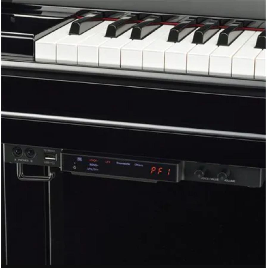 Maar de piano heeft dus meer, namelijk de TransAcoustic technologie. De piano is uitgevoerd met de meest hoogwaardige samples die Yamaha tot hun beschikking heeft zoals die van de Yamaha CFX-vleugel en de Bosendorfer Imperial vleugel. U kunt door middel van het middelste pedaal de aanraking van de hamers met de snaren voorkomen, waardoor de piano overschakelt op het digitale systeem. Sensoren onder de toetsen registreren zeer nauwkeurig elke beweging en zetten deze om in een digitale klank. Deze klanken worden geprojecteerd via het geavanceerde luidsprekersysteem dat is ingebouwd in de zangbodem. Uniek hierbij is dat door de trillingen van de speakers de zangbodem in beweging wordt gebracht en hiermee de akoestische resonantie zoals bij akoestisch spel hoorbaar wordt. Dit komt er op neer dat u op een lager volume digitaal kunt spelen met toch een echte akoestische resonantie. Uiteraard is het ook mogelijk om helemaal stil voor uw omgeving te spelen middels een hoofdtelefoon. De kwaliteit blijft ook hierbij weer van zeer hoog niveau vanwege de binaurale samplingtechnologie waarop automatisch wordt overgeschakeld als u de hoofdtelefoon aansluit. Deze samples zijn zo opgenomen dat het lijkt alsof het geluid echt uit de kast van de piano komt, maar dan via de hoofdtelefoon.