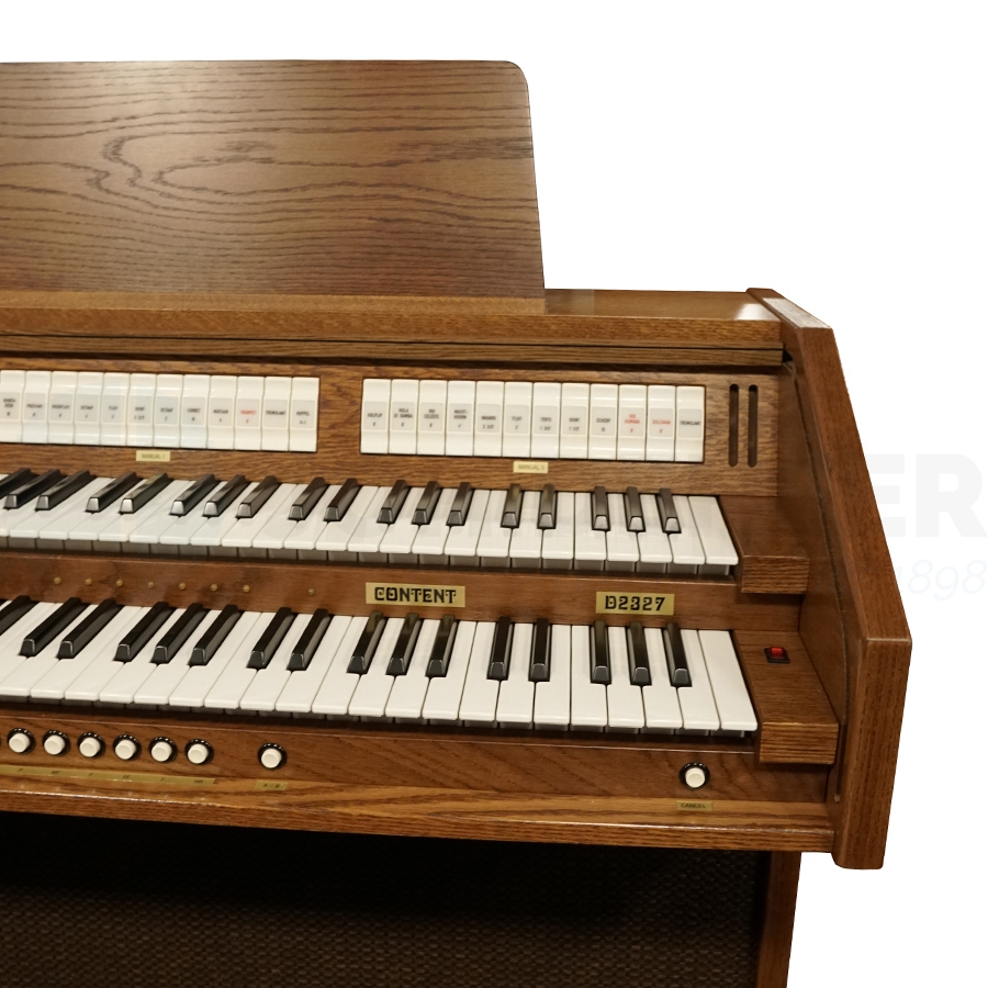 A compact organ with two manuals, no less than 29 voices and 27-tone retractable pedal, the Content D2327 makes an ideal affordable study organ for your home. With the dark oak colour of the organ case and its modest dimensions, this beautiful instrument is sure to match most interiors. Although this instrument is somewhat dated, the quality is very high and it shows after all these years. The furniture is extremely sturdy and everything functions properly.