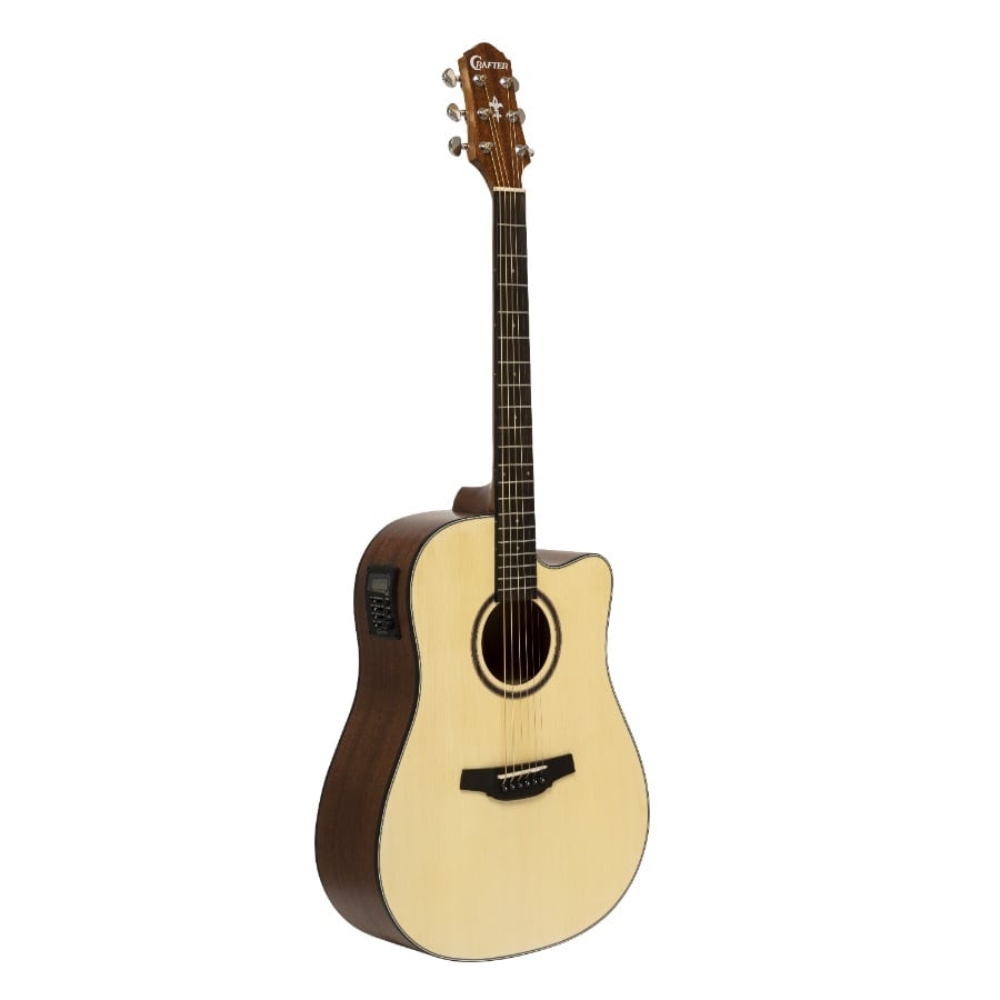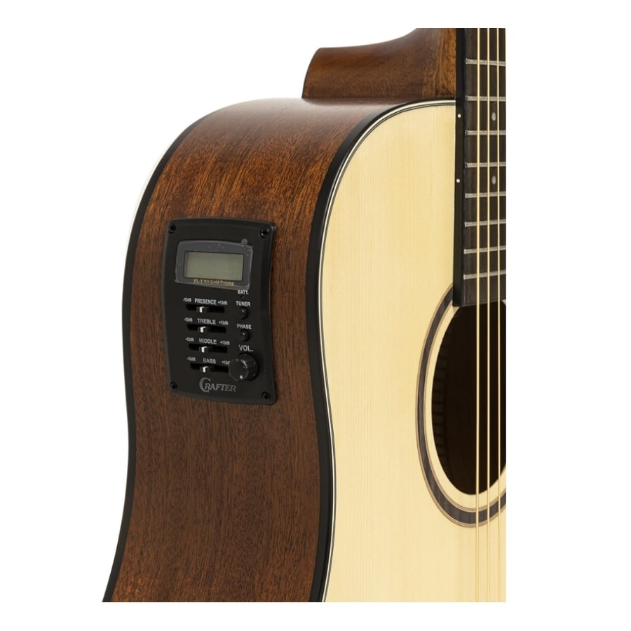 The HD100-CE-N is a dreadnought guitar. Dreadnoughts are the most popular guitars on the market, as they have a nice size and are very versatile. The top of the body is made of Engelmann spruce, which produces a warm sound. The guitar has mahogany back and sides, which produces a warm and powerful sound. The neck is also made of mahogany.