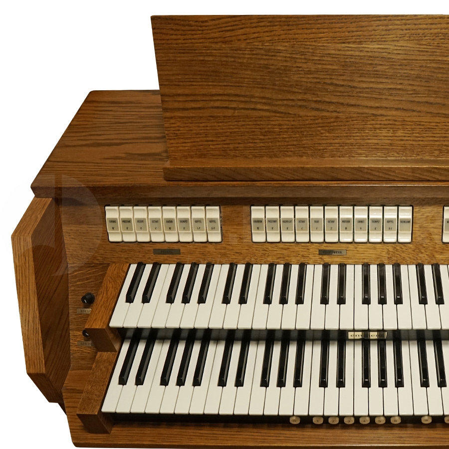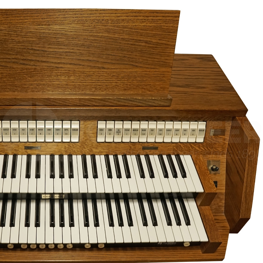 The Eminent DCS200 is a fine compact organ of Dutch manufacture. Its 22-voice disposition allows organists to compose registrations with a great diversity of timbre. An instrument that is very suitable as an organ for the beginning organist, but obviously also satisfactory as a study organ for the more experienced player. The cabinet is in very good condition and is finished in a beautiful classic-looking dark oak colour.