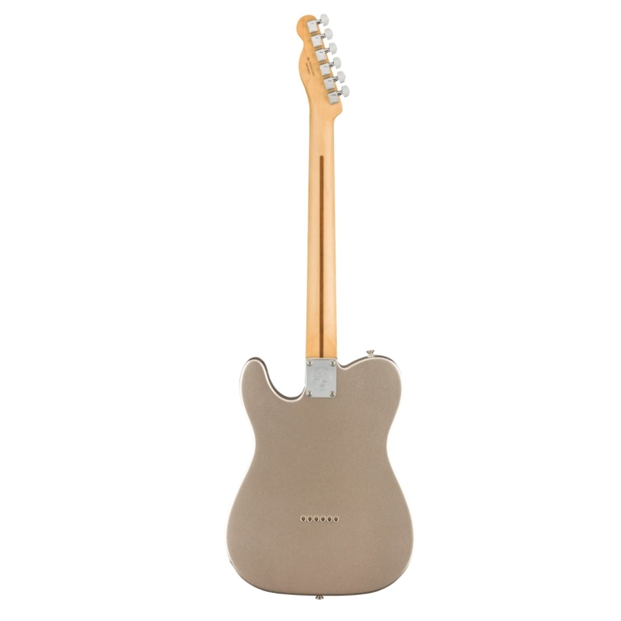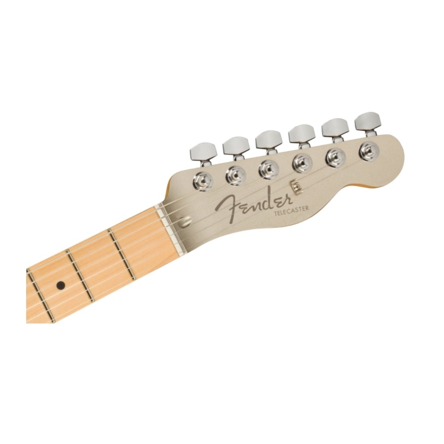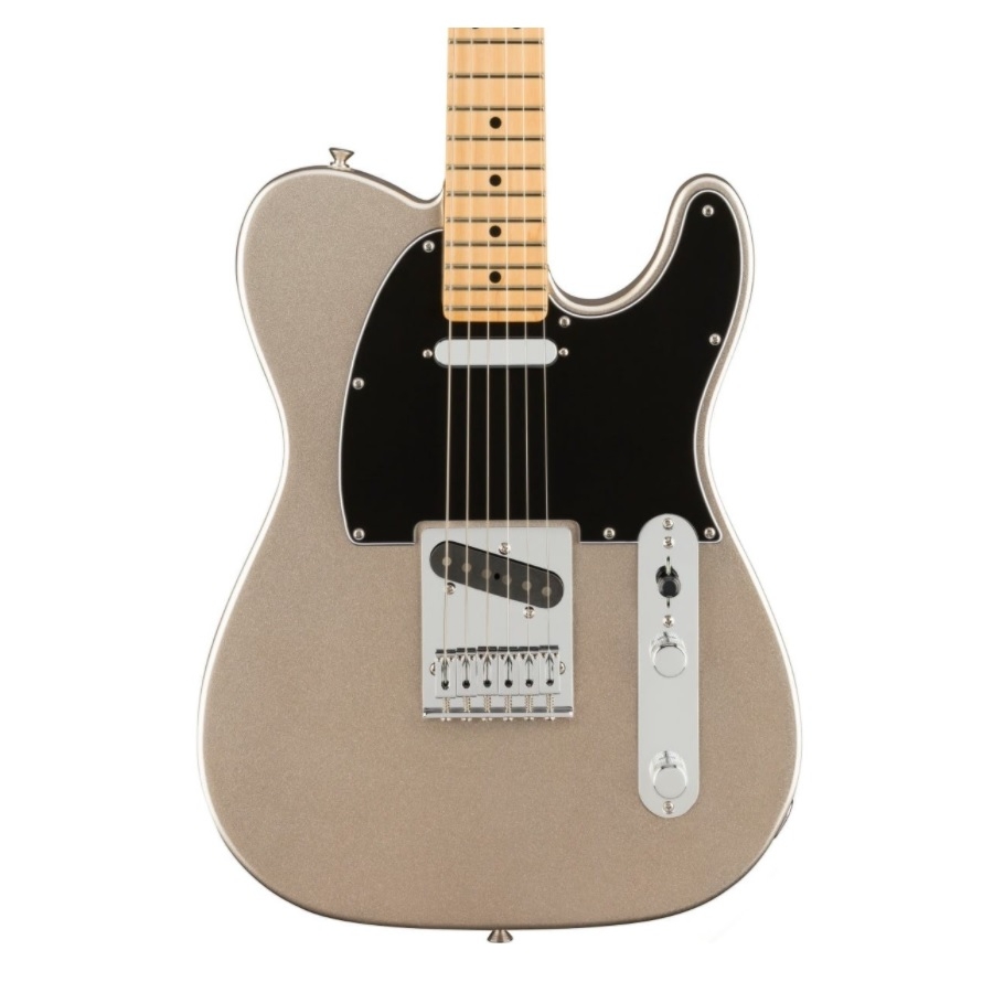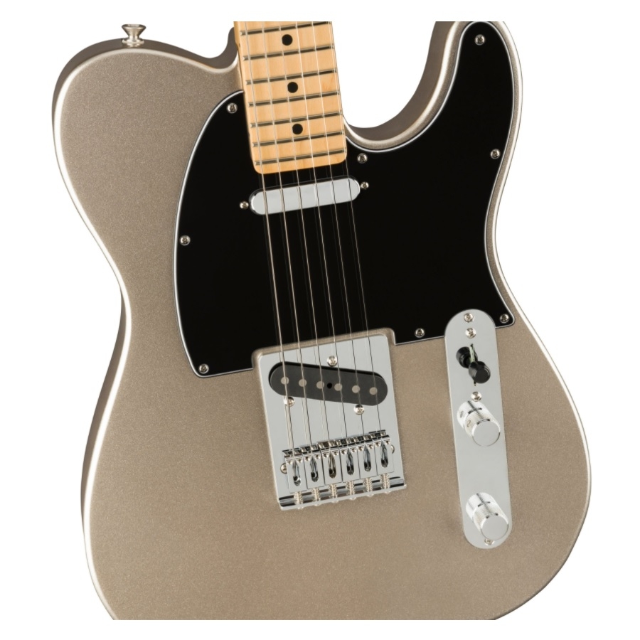 The 75th Anniversary Telecaster has 22 medium sizes frets. The neck is made of maple and has a satin finish, which makes it incredibly comfortable to play. The guitar has a ‘diamond’ colour, which is a light greyish colour with a shiny finish. The body is made of alder, which is a common material Fender uses for their Telecasters. The guitar has a matching headstock, which also makes it look more luxurious.