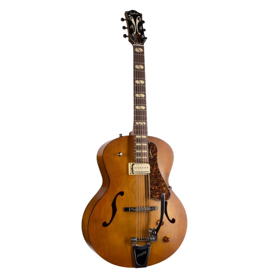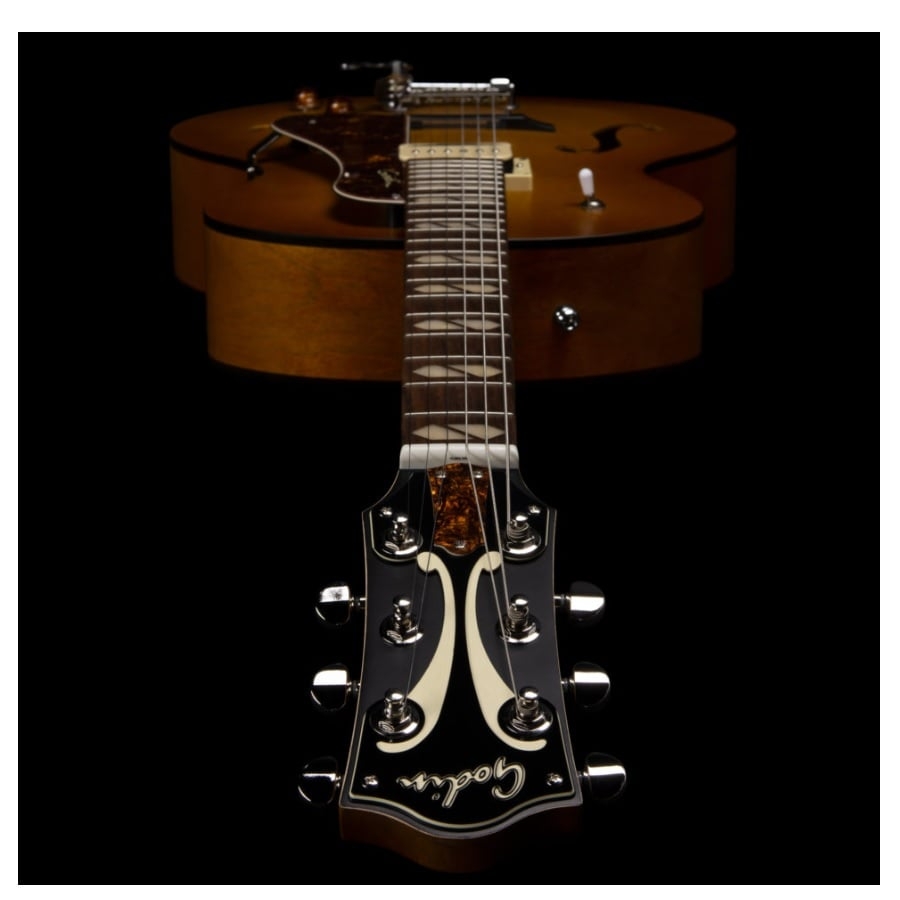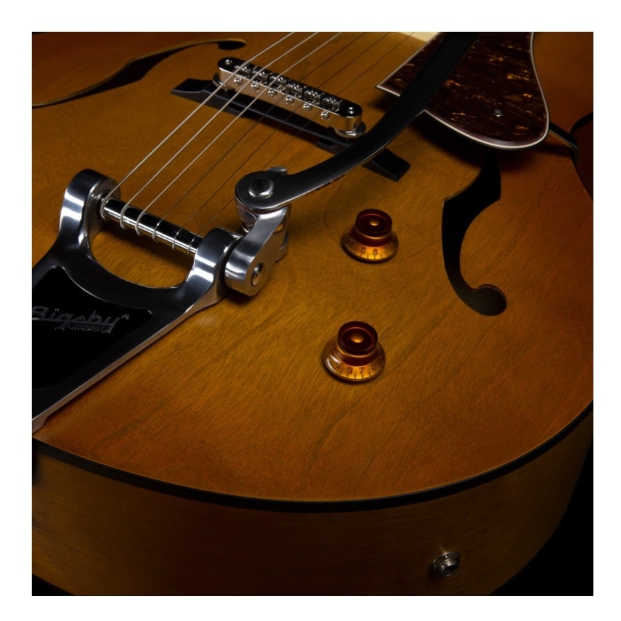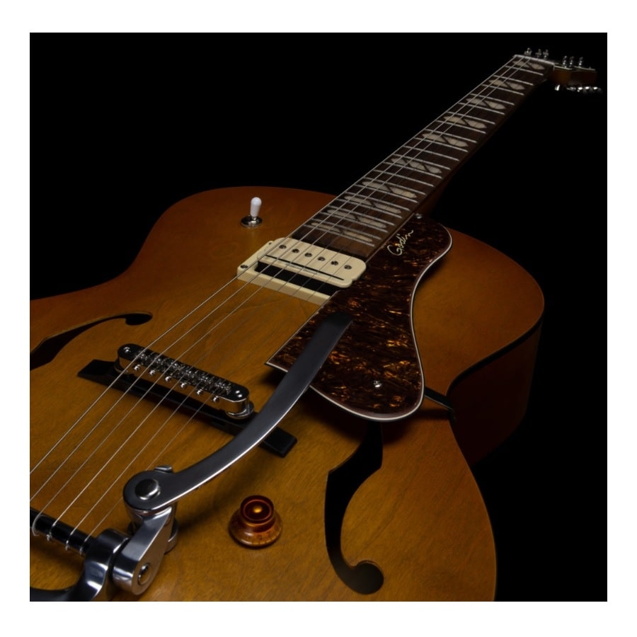 This 5th Avenue is also an archtop guitar. An archtop guitar means exactly that; the body has a slight curve to it, instead of being completely flat like most guitars. Another aspect of an archtop guitar is that there are two F-holes on either side of the bridge. This construction was inspired by violins and produces an amazing sound. The two symmetrical F-holes make it easier for the sound to vibrate and project. With F-holes, an arched construction is necessary, as the soundwaves will not properly move without a round edge. This also means that archtop guitars are hollow, otherwise, the archtop construction will have no effect. The archtop construction is quite popular because the added resonance and projection produce a beautiful, airy, and full sound. Whereas solid-body guitars predominantly produce sound with the vibration of the strings over the pickups, with a little added resonance on the top of the body, hollow-body guitars have more resonance and will thus also sound less ‘flat.’