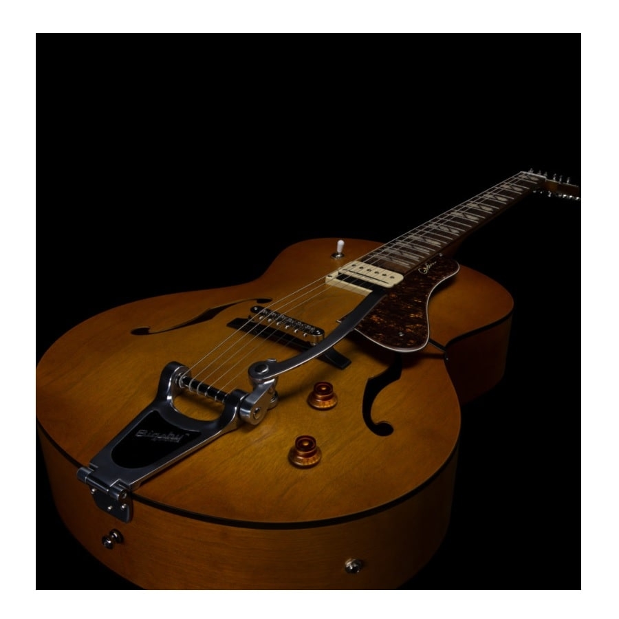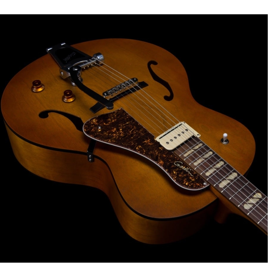 The 5th Avenue Jumbo P-Rail Harvest Gold is also made of the best materials. The entire body is made of Canadian wild cherry. Cherry produces a nice sustain and a soft and warm sound. The guitar has a maple neck and a rosewood fretboard. This a great combination that produces a bright sound and a comfortable playing experience. The guitar also has a Jumbo body, which means it’s a bit bigger than a regular hollow-body guitar. This means the body has more room for resonance. Furthermore, the guitar has a Seymour Duncan P-Rail neck pickup. Seymour Duncan is an American company that’s considered the best at producing guitar pickups. The P-Rail consists of both a humbucker and a P90. This means that you can combine the sharp and bright sound of a P90 with the warm and full sound of a humbucker. The pickup can also be split.