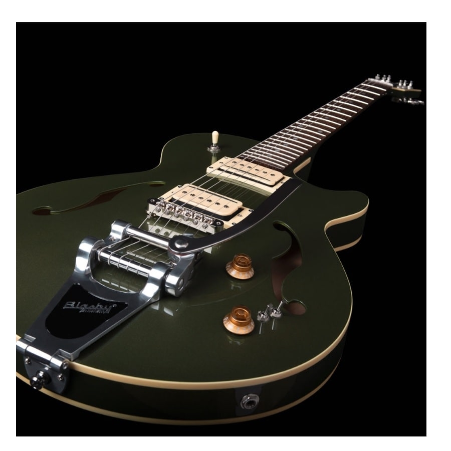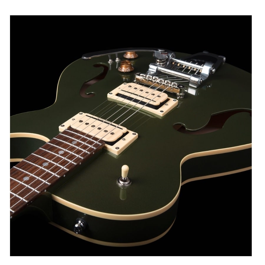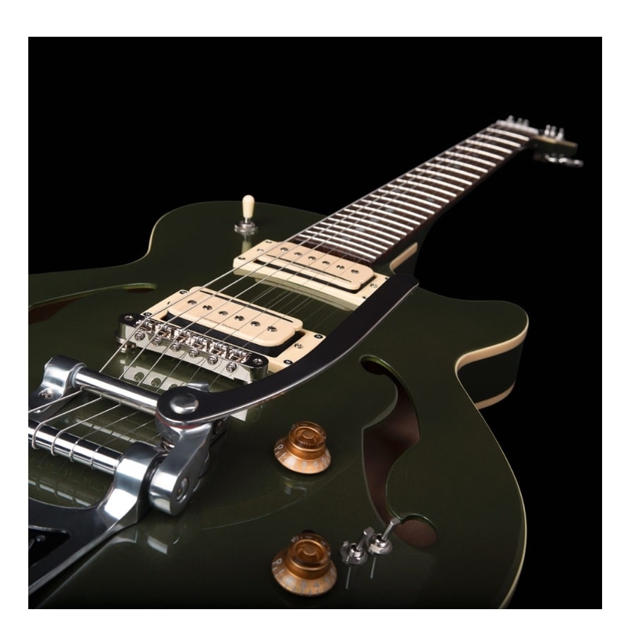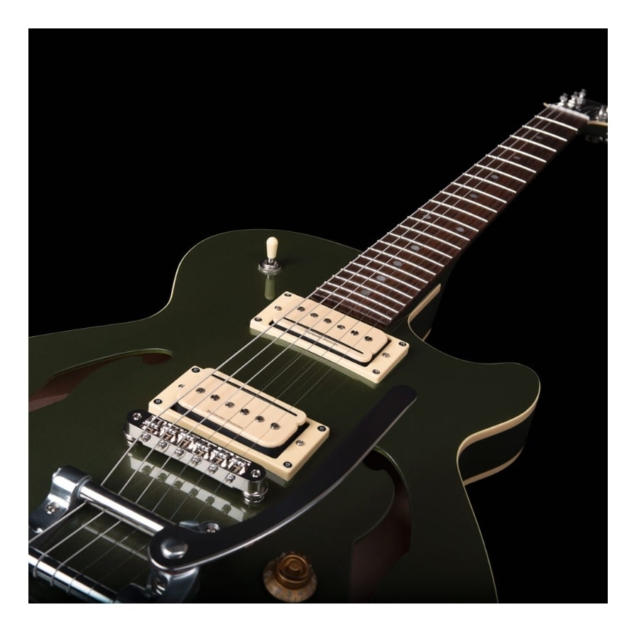 The Montreal Premiere LTD Desert Green is an amazing guitar. It doesn’t only look unique due to its Desert Green Colour, but the guitar also contains a Bigsby tremolo system and two Seymour Duncan P-Rails. These are strange pickups, as they are humbuckers that consist of a narrow Hot Rails single coil and a vintage P90. These pickups were designed to be able to produce a super versatile guitar. This is because the humbuckers can be split into either a P90 or a single coil. The guitar has a Canadian wild cherry body, which sounds warm and articulated. Furthermore, the guitar has a mahogany neck and a rosewood fretboard.