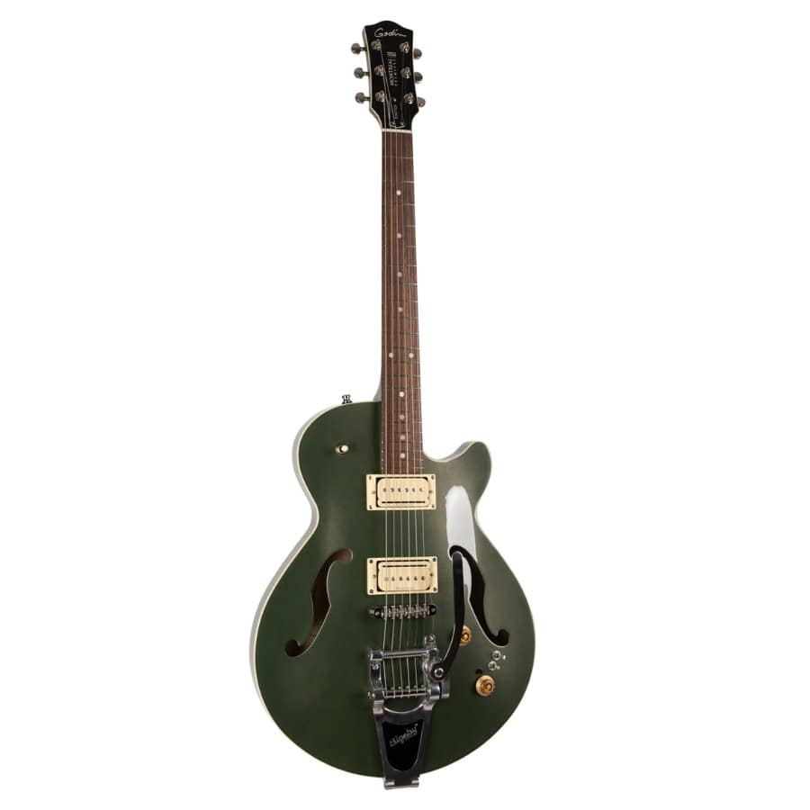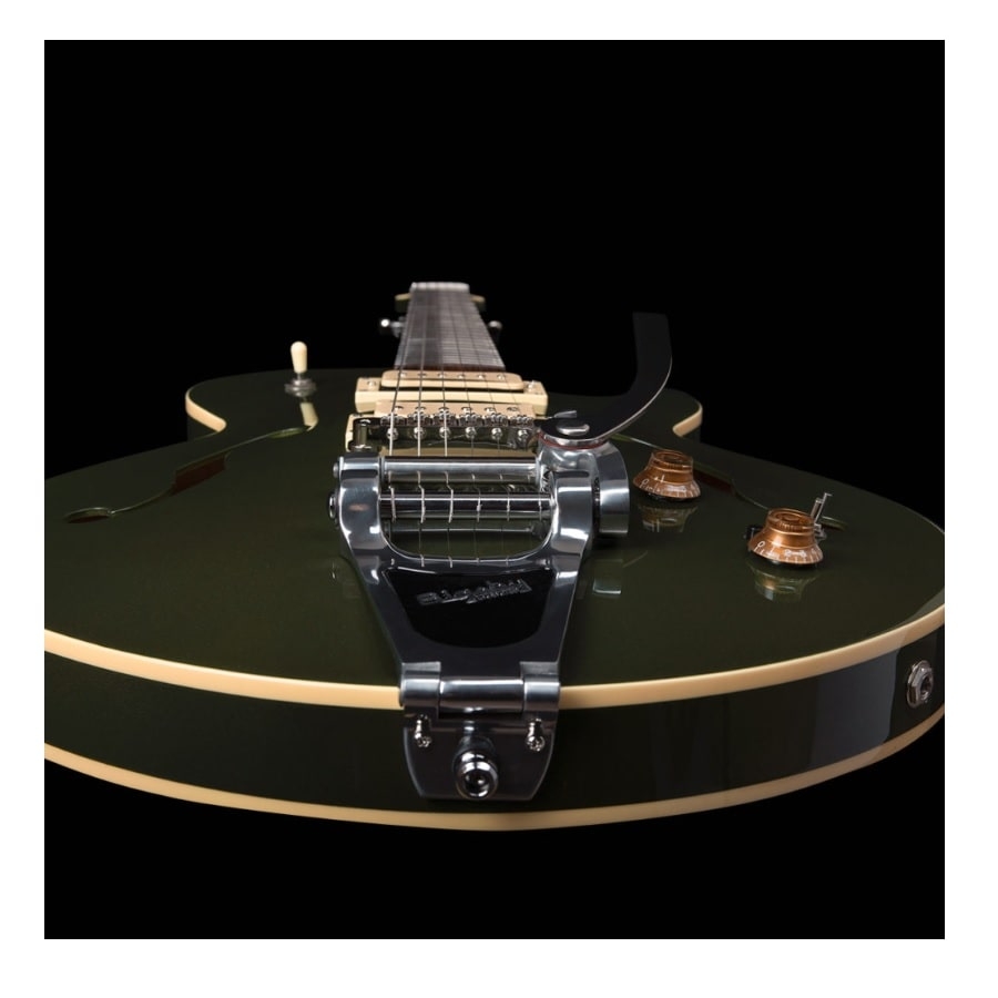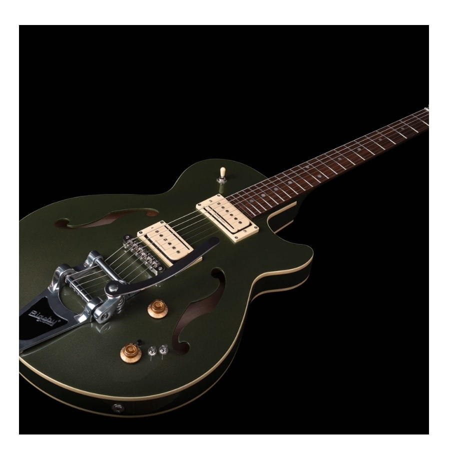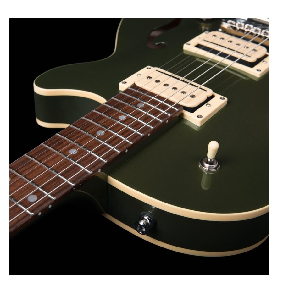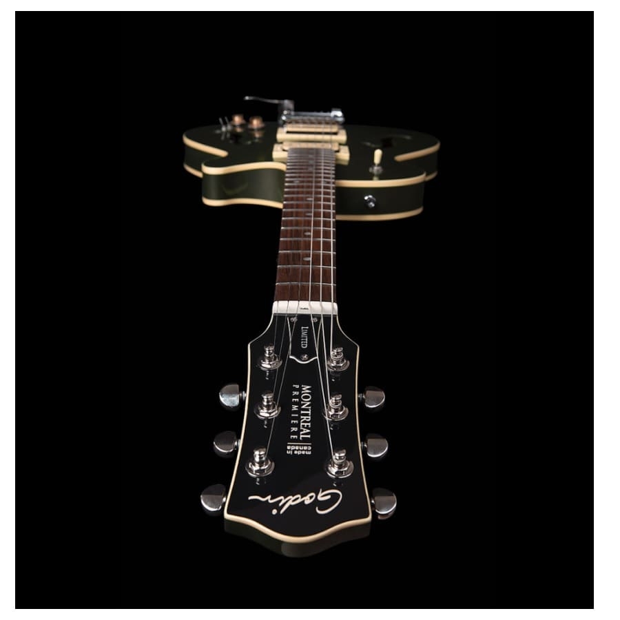 The Montreal Premiere LTD Desert Green is an amazing guitar. It doesn’t only look unique due to its Desert Green Colour, but the guitar also contains a Bigsby tremolo system and two Seymour Duncan P-Rails. These are strange pickups, as they are humbuckers that consist of a narrow Hot Rails single coil and a vintage P90. These pickups were designed to be able to produce a super versatile guitar. This is because the humbuckers can be split into either a P90 or a single coil. The guitar has a Canadian wild cherry body, which sounds warm and articulated. Furthermore, the guitar has a mahogany neck and a rosewood fretboard.