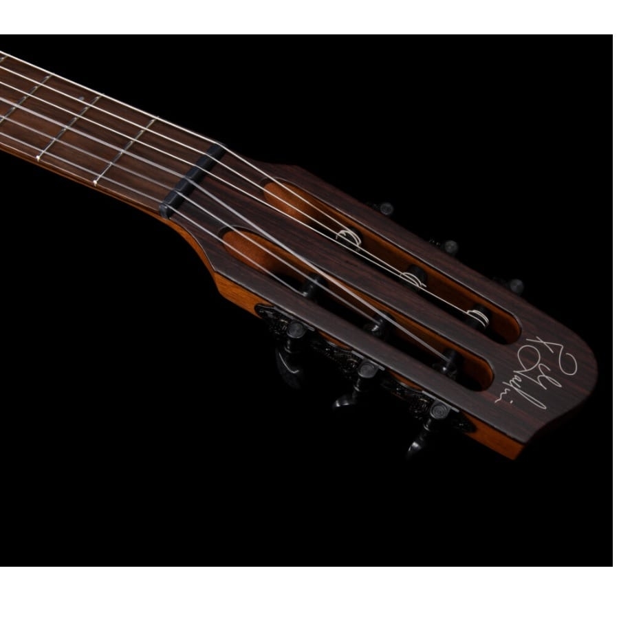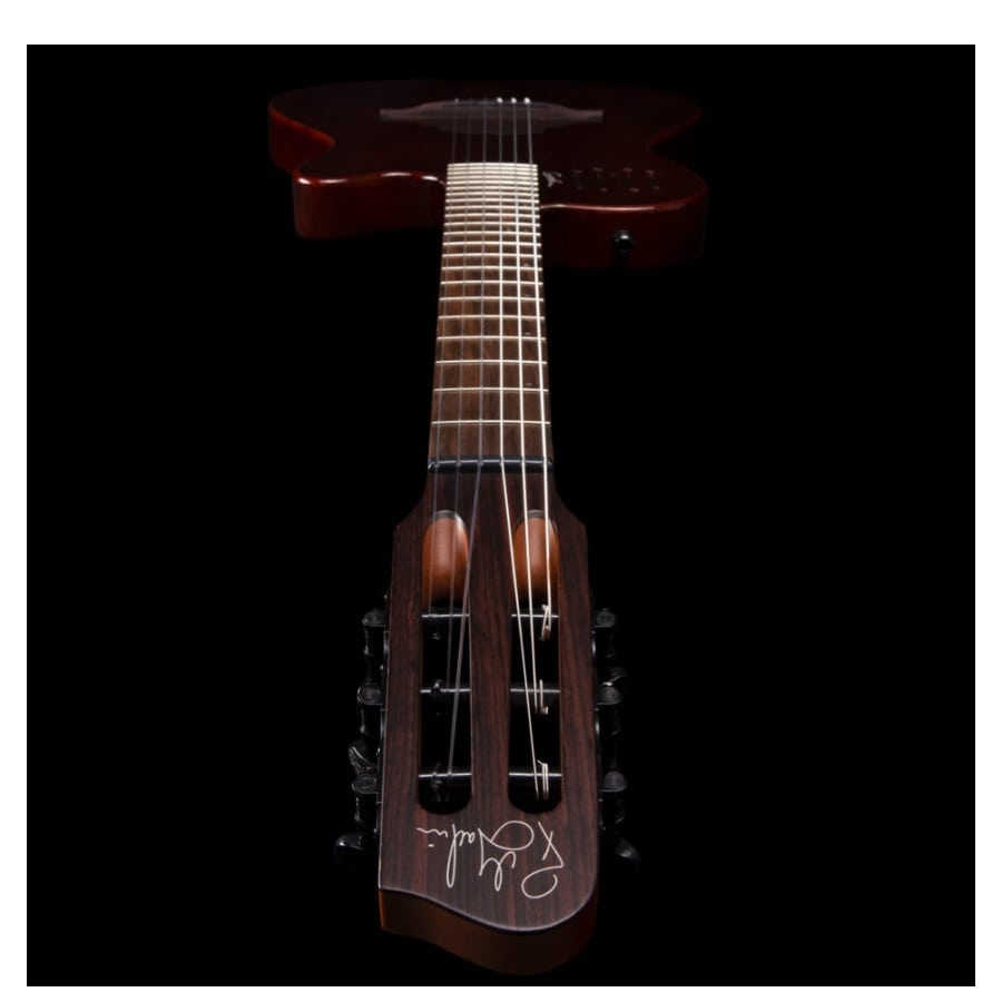 The MultiAc is a combination between a classical guitar and an electric guitar. This is very innovative, because it’s quite new. The MultiAc is inspired by solid body electric guitars, but with a semi-hollow body design. This means the body isn’t completely hollow, but has chambers instead. This means the vibrations of the strings resonate a bit better. The guitar also doesn’t have a sound hole, which means the resonance comes from the wood, instead. The guitar also has a classical design: the strings are made from nylon and the headstock and the bridge are inspired by classical guitars. The guitar has a piezo pickup. This is a standard acoustic pickup, which means the sound is as authentic as possible, and the pickup will not distort the sound. The sound of the guitar can be altered with the sliders on the body. The guitar has a standard jack input, which means it can be connected to an amp, but it also has a XRL-input, which means it can be connected to a synthesizers, which means the guitar is really versatile.