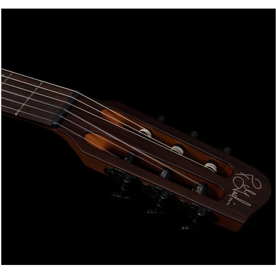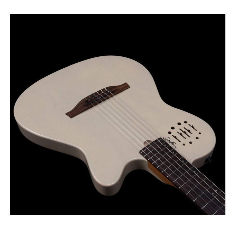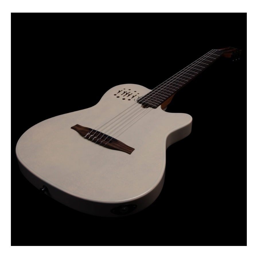 The MultiAc is a combination between a classical guitar and an electric guitar. This is very innovative, because it’s quite new. The MultiAc is inspired by solid body electric guitars, but with a semi-hollow body design. This means the body isn’t completely hollow, but has chambers instead. This means the vibrations of the strings resonate a bit better. The guitar also doesn’t have a sound hole, which means the resonance comes from the wood, instead. The guitar also has a classical design: the strings are made from nylon and the headstock and the bridge are inspired by classical guitars. The guitar has a piezo pickup. This is a standard acoustic pickup, which means the sound is as authentic as possible, and the pickup will not distort the sound. The sound of the guitar can be altered with the sliders on the body. The guitar has a standard jack input, which means it can be connected to an amp, but it also has a XRL-input, which means it can be connected to a synthesizers, which means the guitar is really versatile.