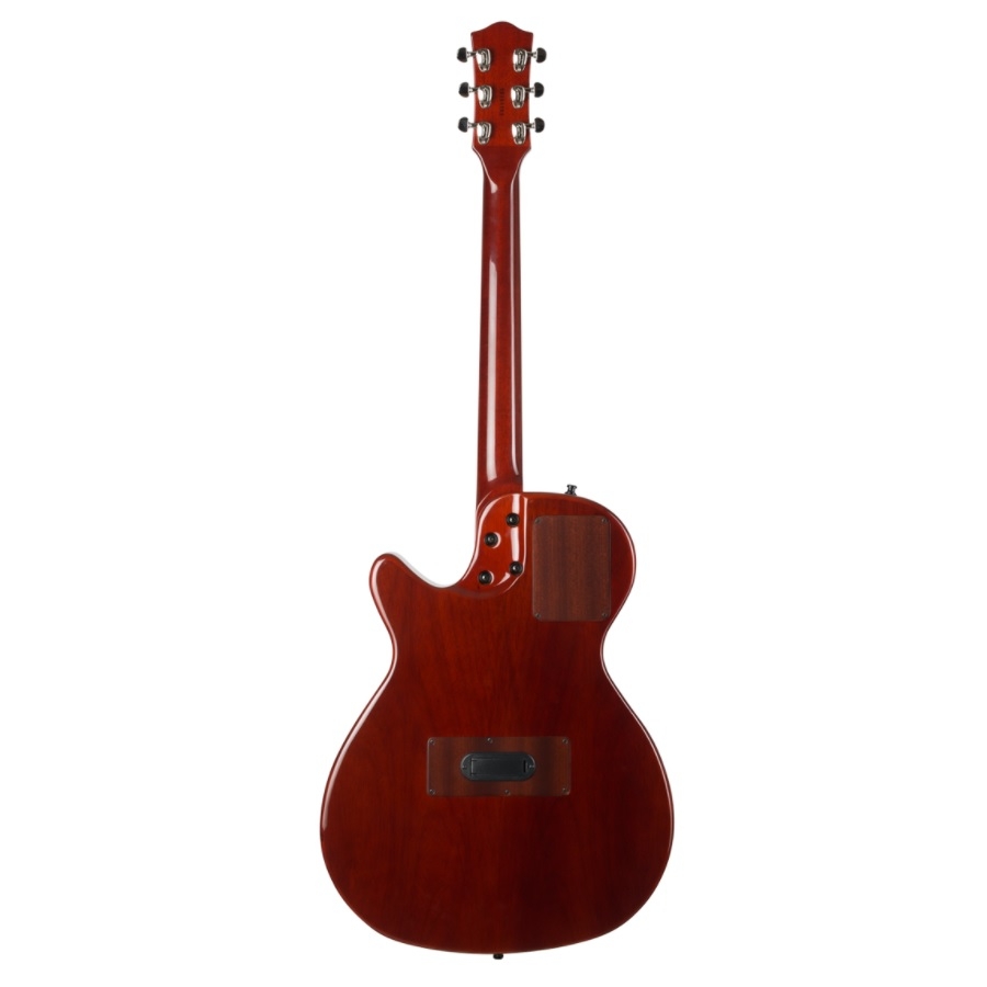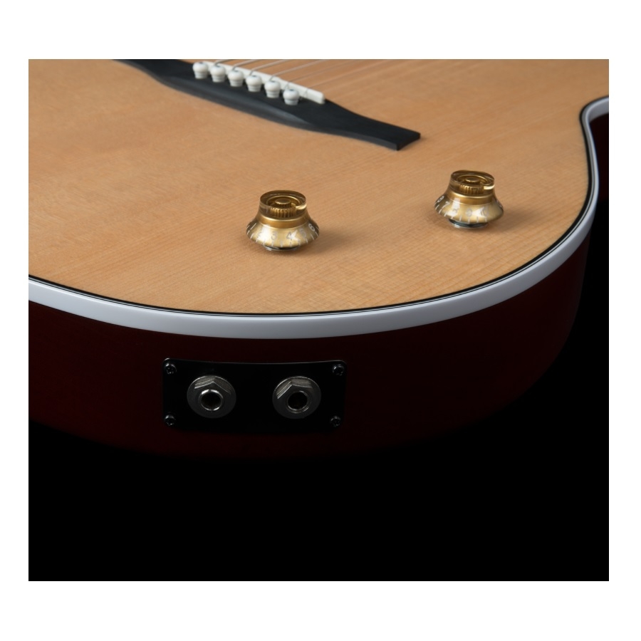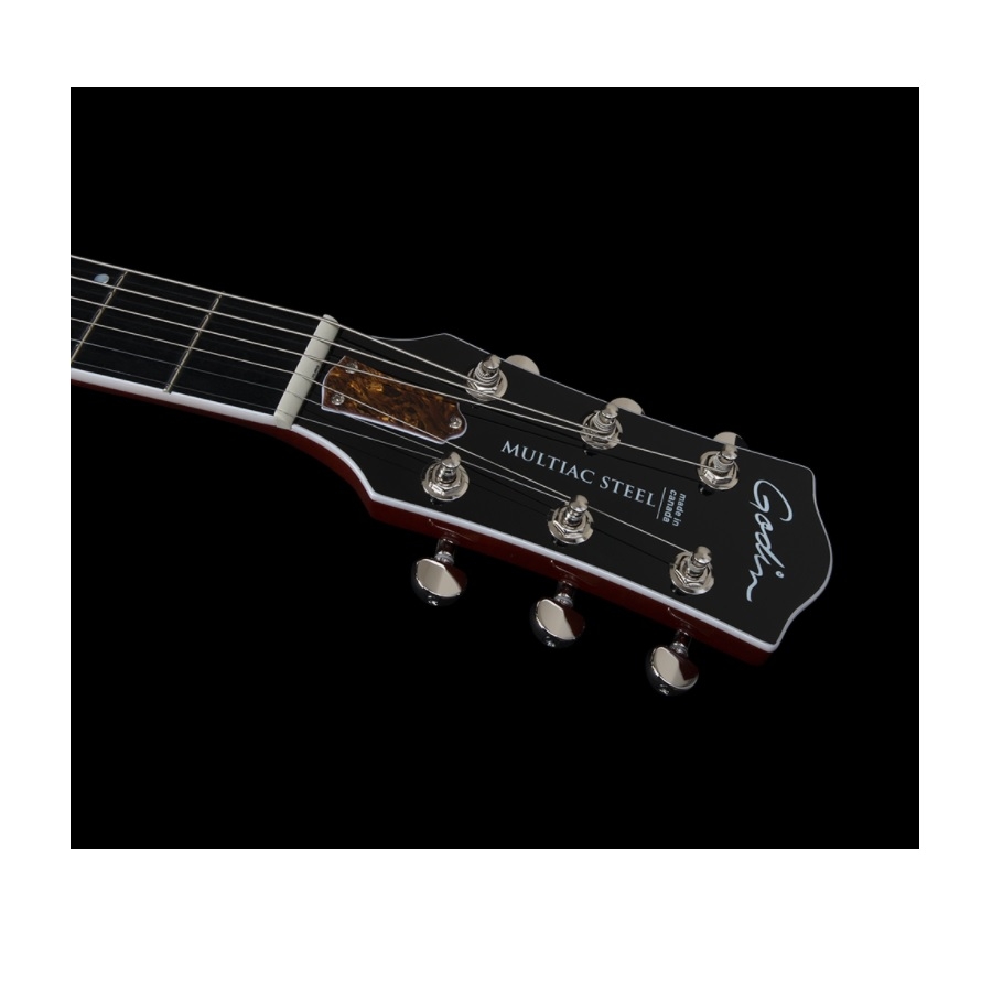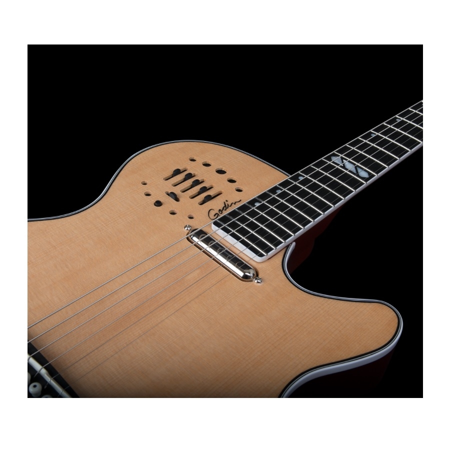 The MultiAc Steel has a mahogany body, which produces a balanced and powerful sound. The top of the body is made of spruce. Spruce is very popular because it produces a beautiful and warm sound. The neck is made of mahogany and the fretboards is made of Richlite. Richlite is a new synthetic material, specifically made as an alternative for wood. It consists of a combination of resin and wood fibres, which have been pressed together under a high temperature. Richlite is very rigid, which means it can keep the neck straight, and it is also very smooth, which means it plays great. Furthermore, Richlite doesn’t require maintenance, either. The MultiAc Steel is a professional and innovative guitar by Godin!