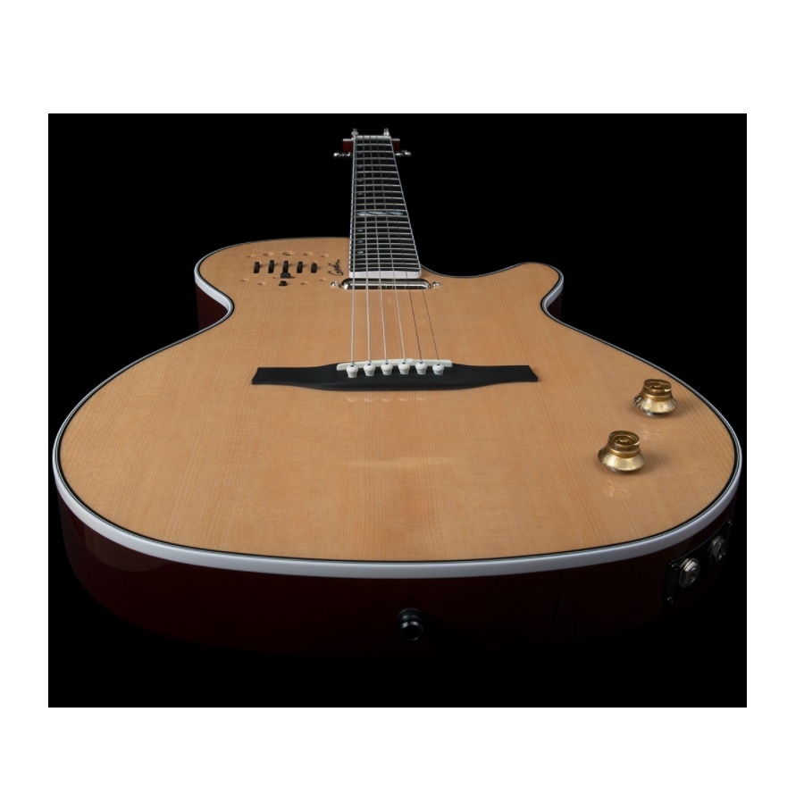 The MultiAc guitars are electric classical guitars. The MultiAc Steel is thus an exception; this guitar has steel strings which means it’s more a combination between a western guitar and an electric guitar. The goal of this series was to be able to produce the ideal amplified acoustic sound, without feedback, interference, and distortion. Semi-acoustic guitars tend to have these issues. Because the MultiAc is specifically made for amplification, these issues were solved. The guitar has a piezo pickup under the bridge, but also a single-coil pickup in the neck. The latter is an electric pickup, which means the MultiAc can also be used as an electric guitar. Consequently, the MultiAc has the possibility to produce an authentic and beautifully amplified acoustic sound, but also an amazing electric sound. These functions can be used with the same amp, but the guitar has two jack inputs, which means the piezo pickup can be connected to an acoustic amp, and the single-coil pickup to an electric amp.
