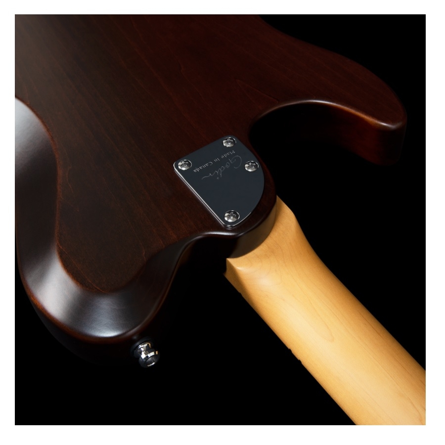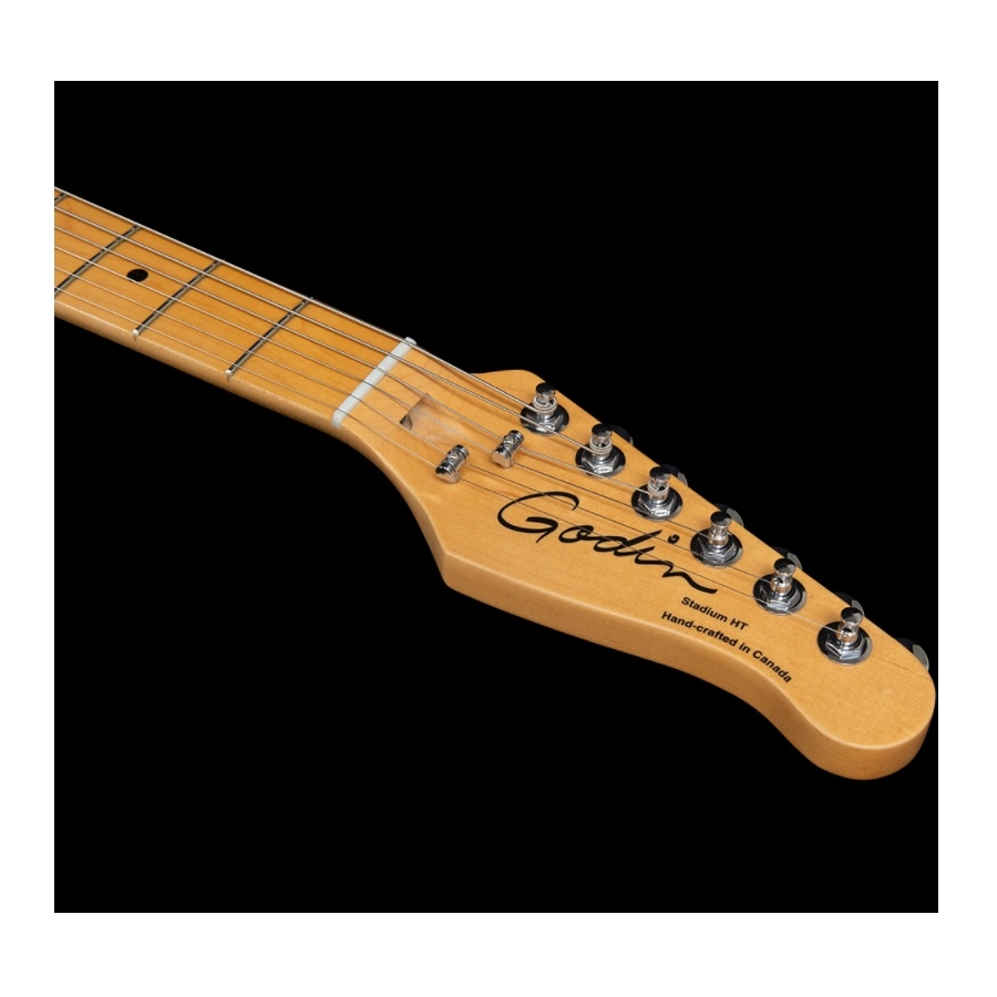 The body of the guitar is made of basswood. Basswood is a softwood with a great sustain. The neck and the fretboard are made of maple, which articulates well and has a neutral appearance. The colour of the body is inspired by acoustic guitars, which is why it has a dark wooden colour, but with a semi-gloss finish. What is also quite noticeable, is that the guitar doesn’t have a pickguard. Godin managed to hide all the wiring underneath the bridge and the control plate, which gives the guitar a professional and luxurious appearance. The Stadium HT Havana Brown is an amazing and unique guitar!