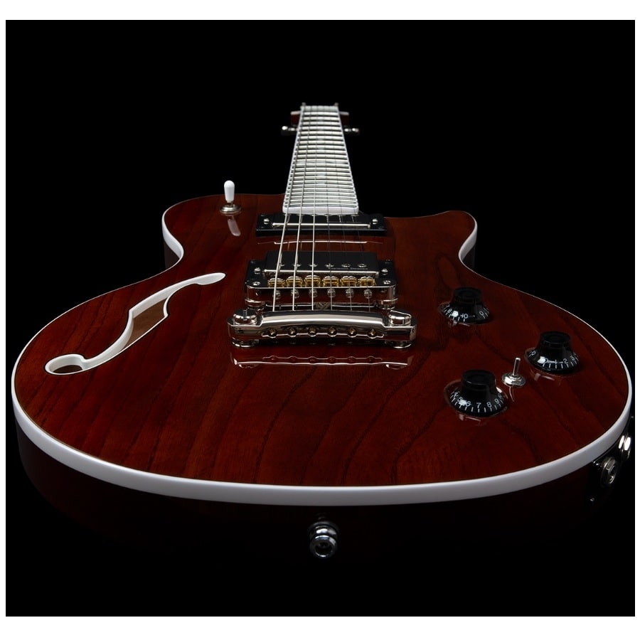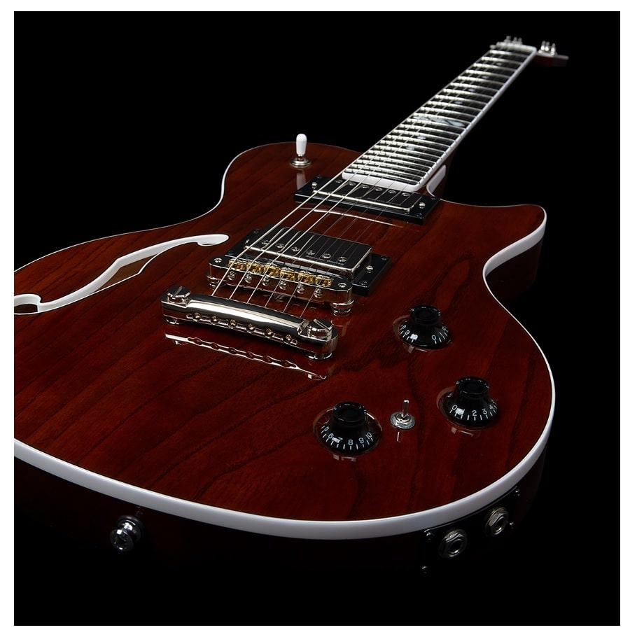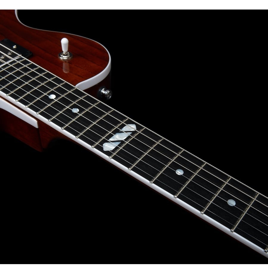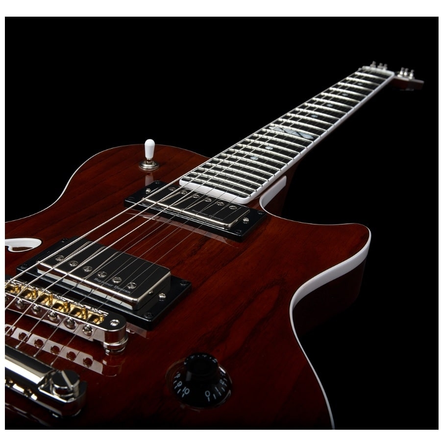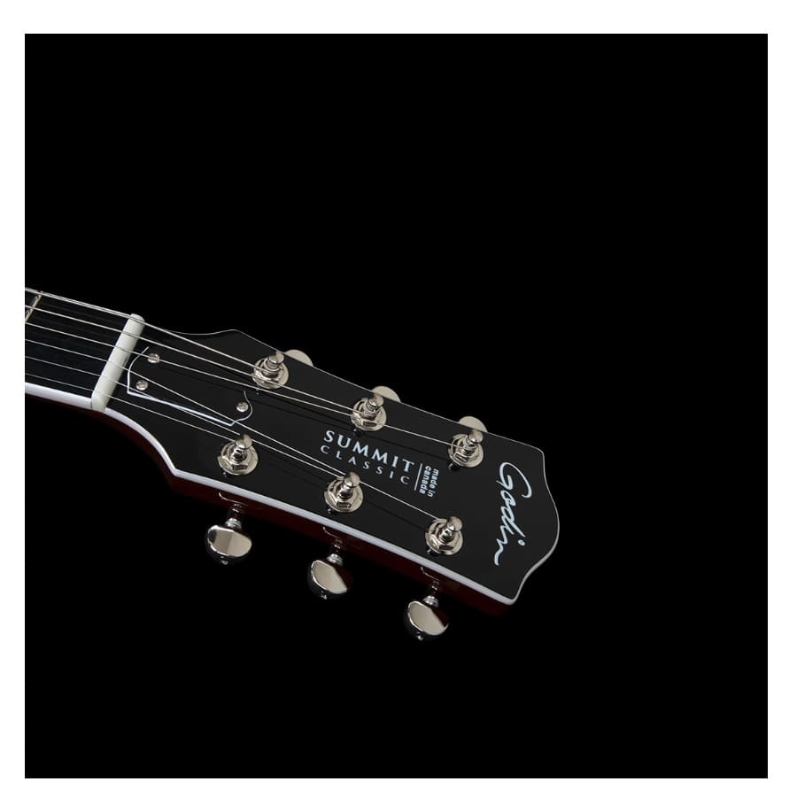 Because the Summit Classic A/E is a semi-hollow body guitar, it means the body isn’t completely solid. The body is made of mahogany and contains hollow compartments. Godin did this so the guitar wouldn’t be so heavy. Les Pauls are generally considered the heaviest guitar on the market, and this can be very uncomfortable. Subsequently, Godin decided to use a lightweight tonewood and to carve out hollow compartments in the body. Furthermore, the hollow compartments produce a full and deep sound. The neck is made of mahogany and the fretboard of Richlite. This is a great combination and results in a comfortable experience.