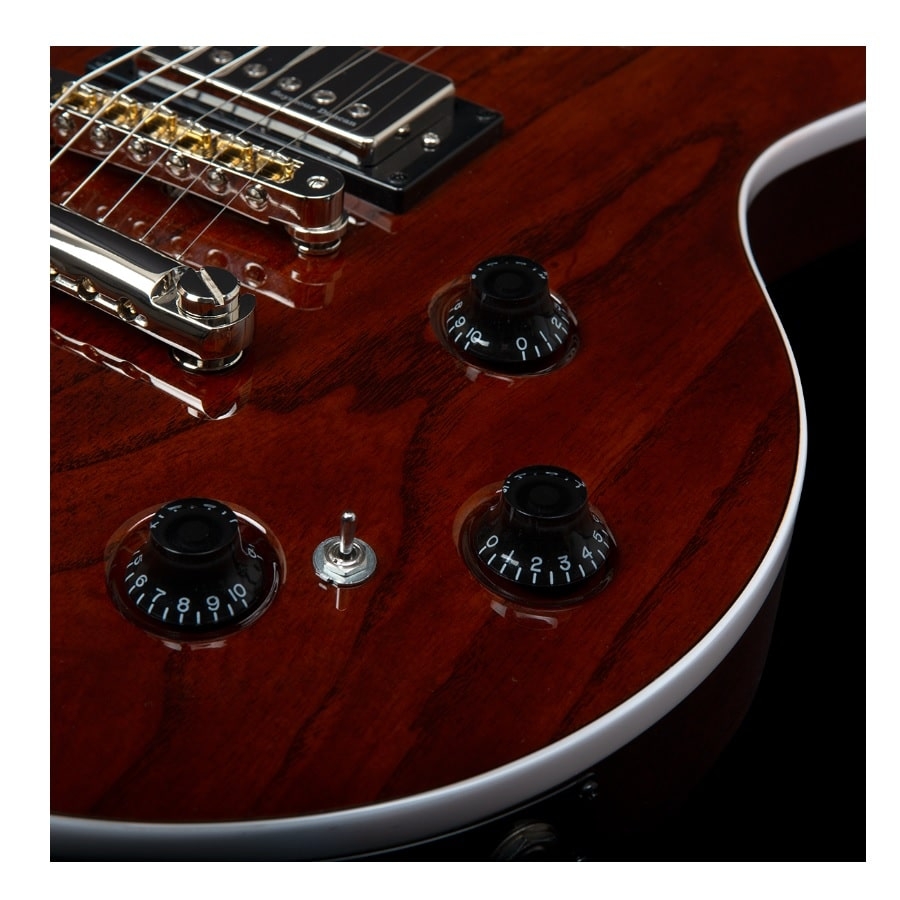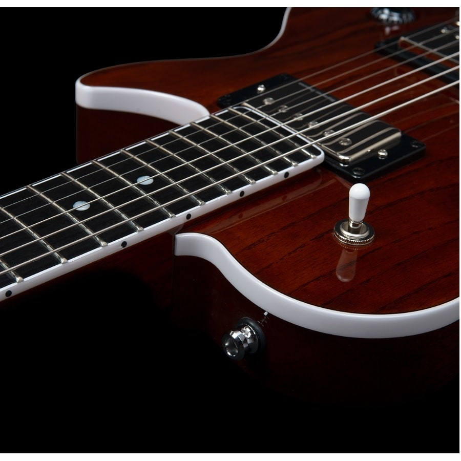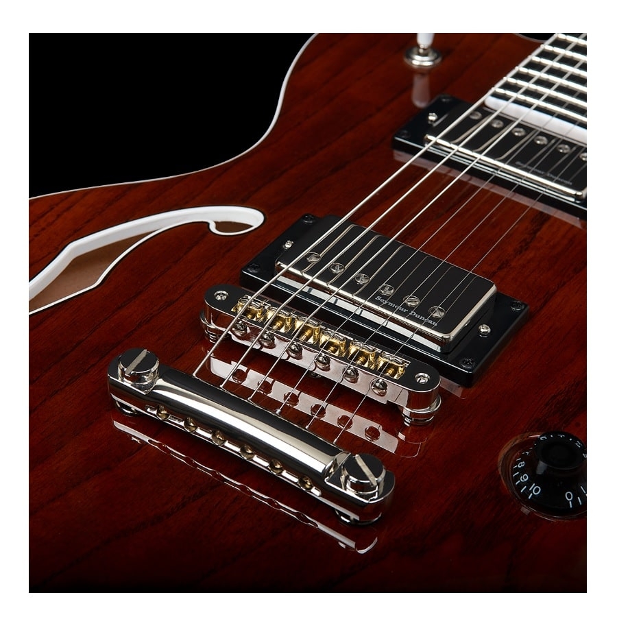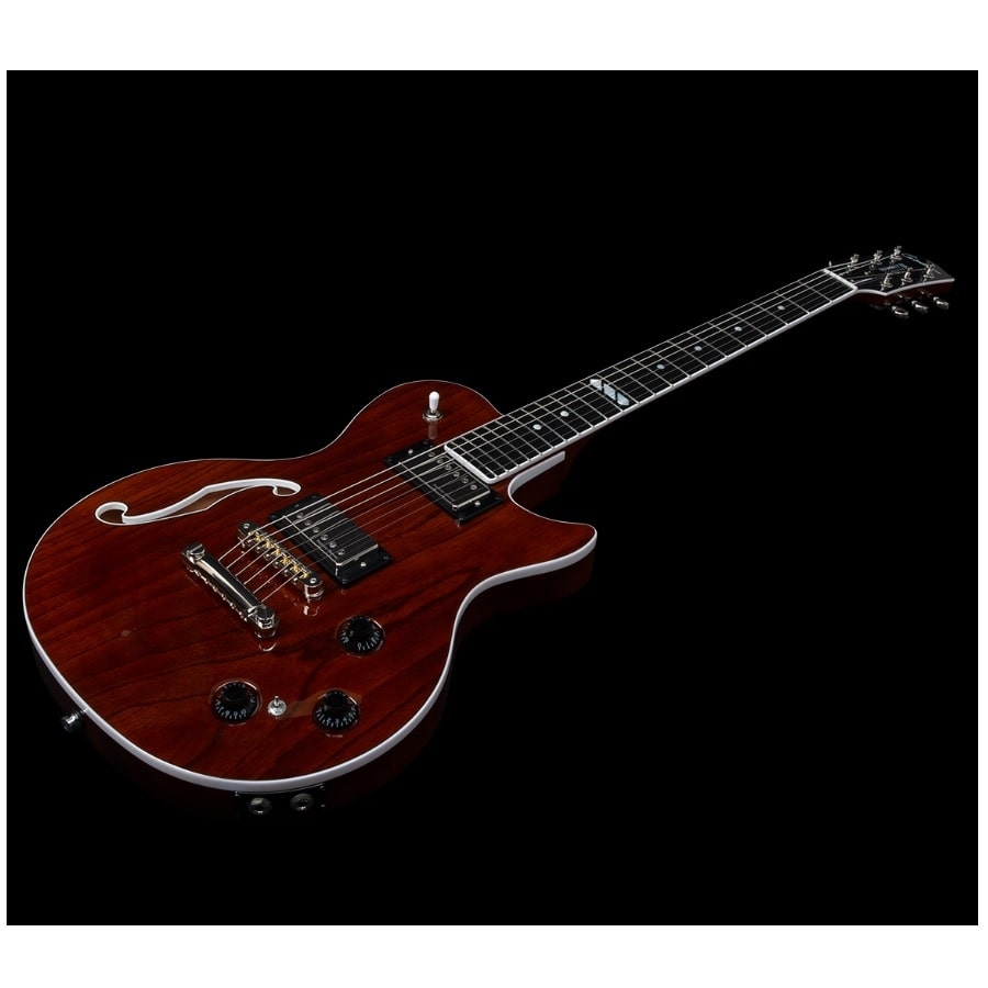 The Summit Classic A/E is a semi-hollow guitar and the shape is inspired by the popular Les Paul. Consequently, the guitar has two humbuckers. Humbuckers were designed in tandem with the Les Paul, and that combination is what put Gibson on the radar. A humbucker consists of double coils, which means the coils connect in a circle. Humbuckers produce a very different sound than single coils. Humbuckers sound warm and full, are better used with distortion, and produce less feedback, whilst single coils have a nicer clean sound and sound brighter. The two humbuckers can be altered with the three-way switch.