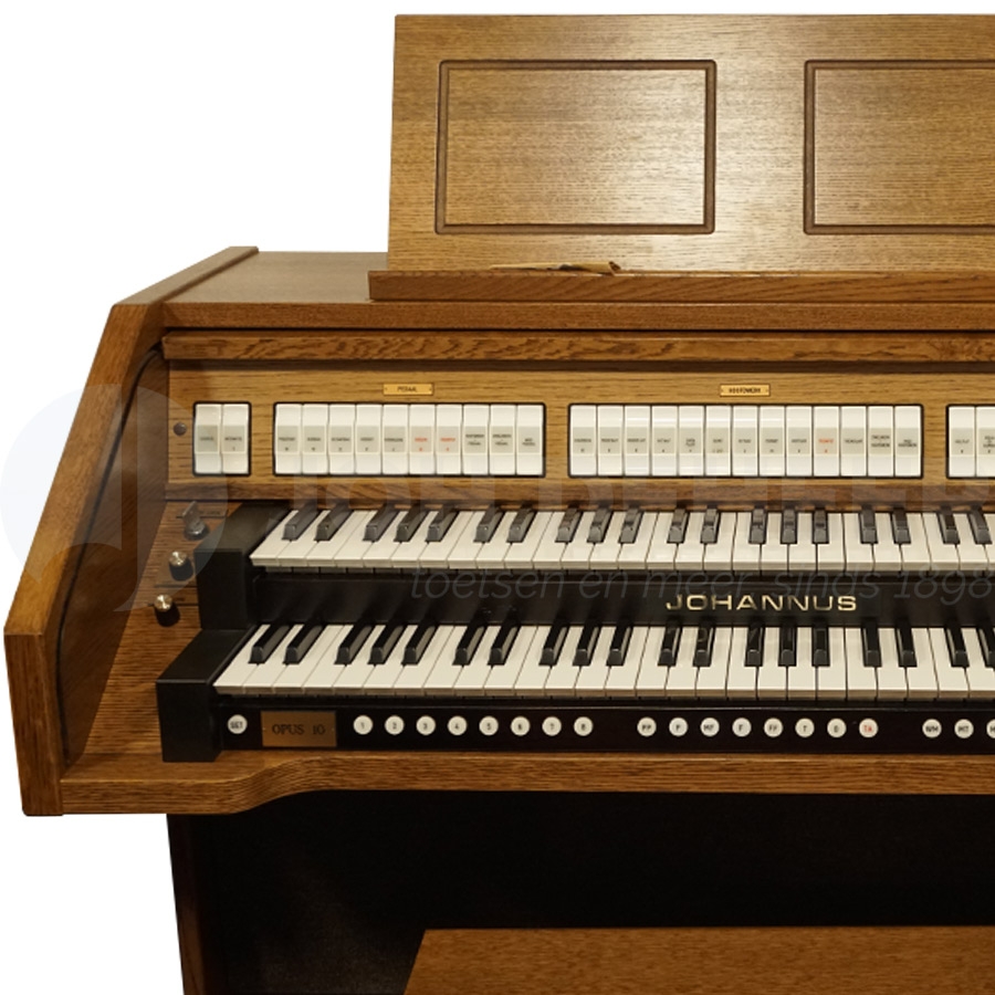 The Johannus Opus 10 organ features two manuals, each with five octaves, and a 13-note straight pedalboard. Full registration is available for both manual and pedal. Housed in a white oak cabinet, the organ is in excellent condition. This compact organ is ideal for the passionate hobbyist!