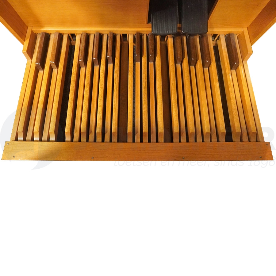 The instrument is equipped with two full manuals and a 27-tone bass pedal. There are even two swell pedals built in for full control over all volumes. The duration of the reverb, for instance, can also be controlled with a simple turn of a knob.