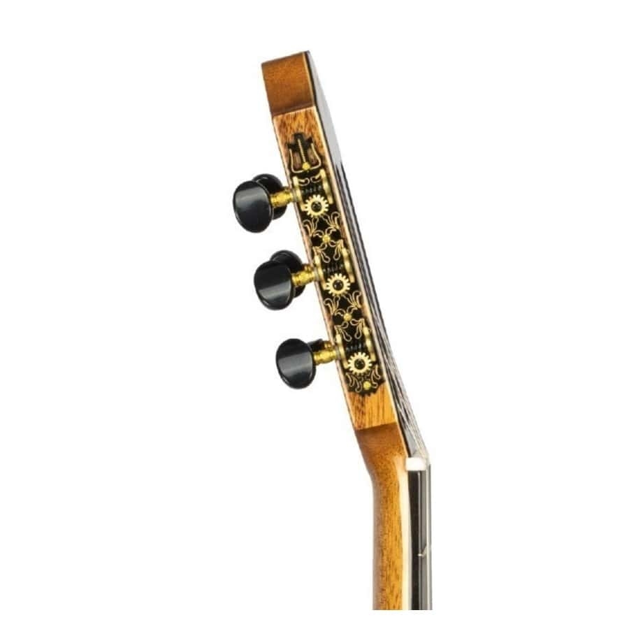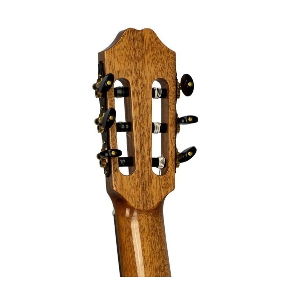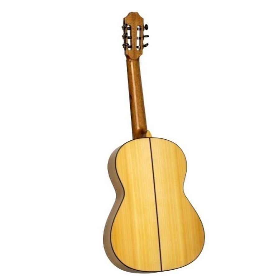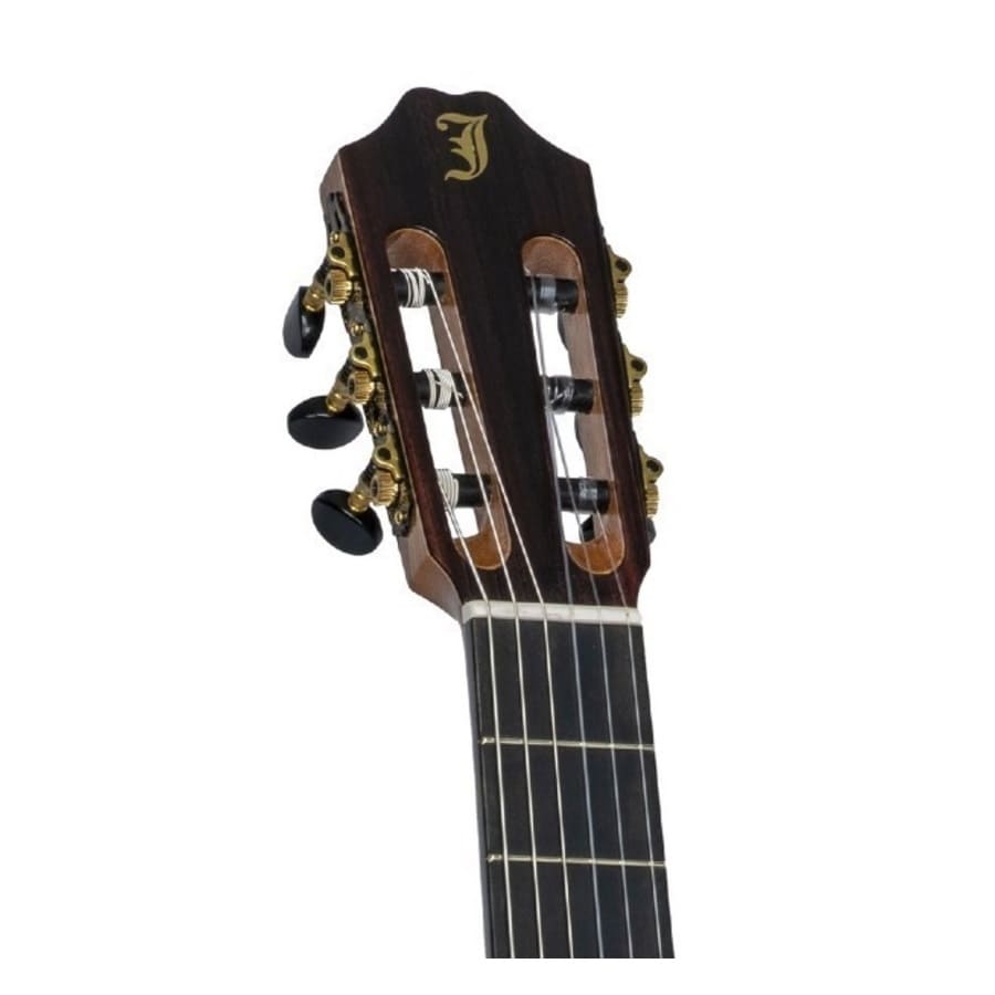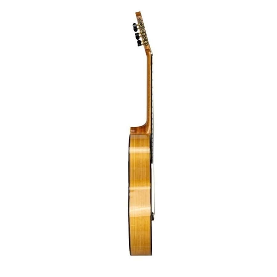 The 10F is an amazing Flamenco guitar from Juan Salvador. This is clear from the materials they used to make the guitar. The guitar has a solid spruce top and cypress back and sides. This is an awesome combination that results in a warm and articulated sound. Furthermore, the guitar has a mahogany neck and an ebony fretboard. This is a popular combination that results is a strong and sturdy neck – and thus great tuning stability – and a comfortable experience. Moreover, the guitar has a beautiful wooden rosette and a see-through pickguard for a professional look.