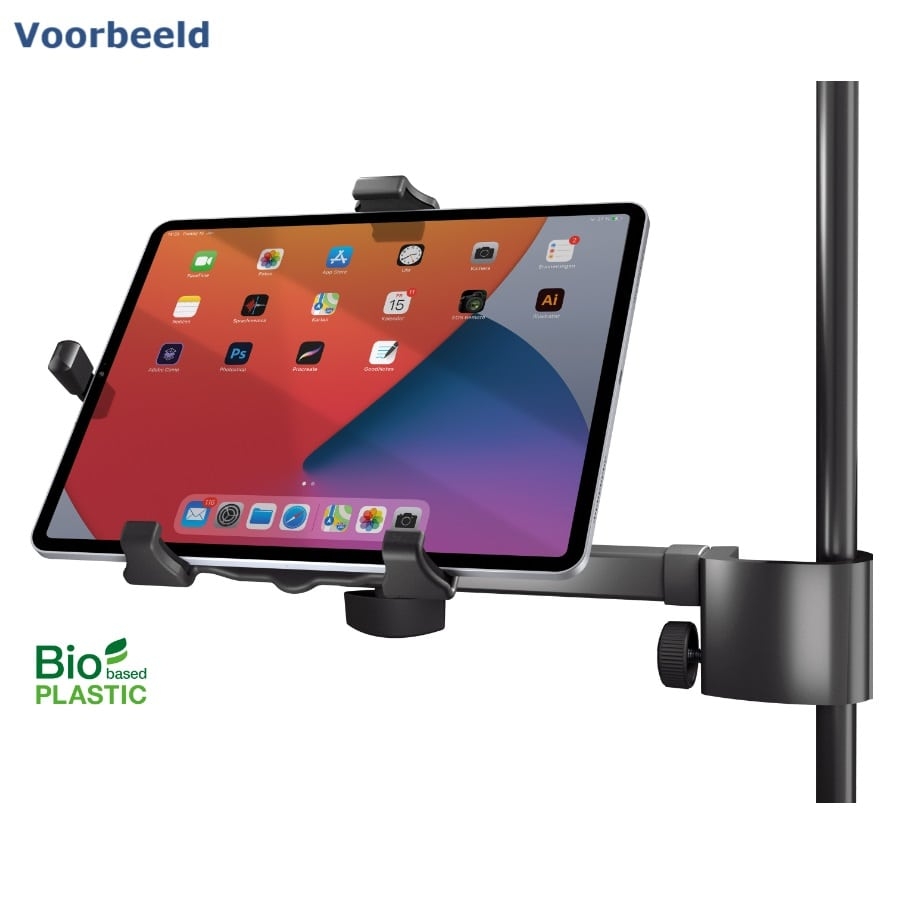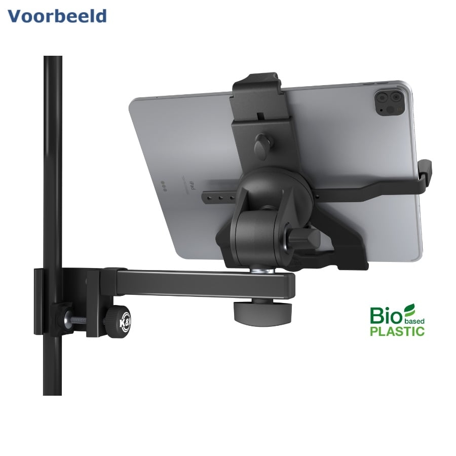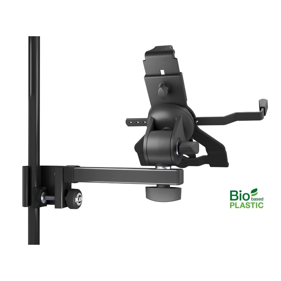 The 19743 is a handy tablet holder from Konig & Meyer. You can attach the holder to your stand with the clamp so the holder will be sturdy. The clamp has a maximum width of 30 millimetres. The holder is suitable for tablets between 10 and 16 inches. The stand can be used with most tablet cases, with a maximum width of 18 millimetres. Furthermore, the angle of the tablet can be adjusted with the swivel. The holder itself is made of bio-based plastic, which means that the plastic consists of 50-100% renewable plant-based materials.