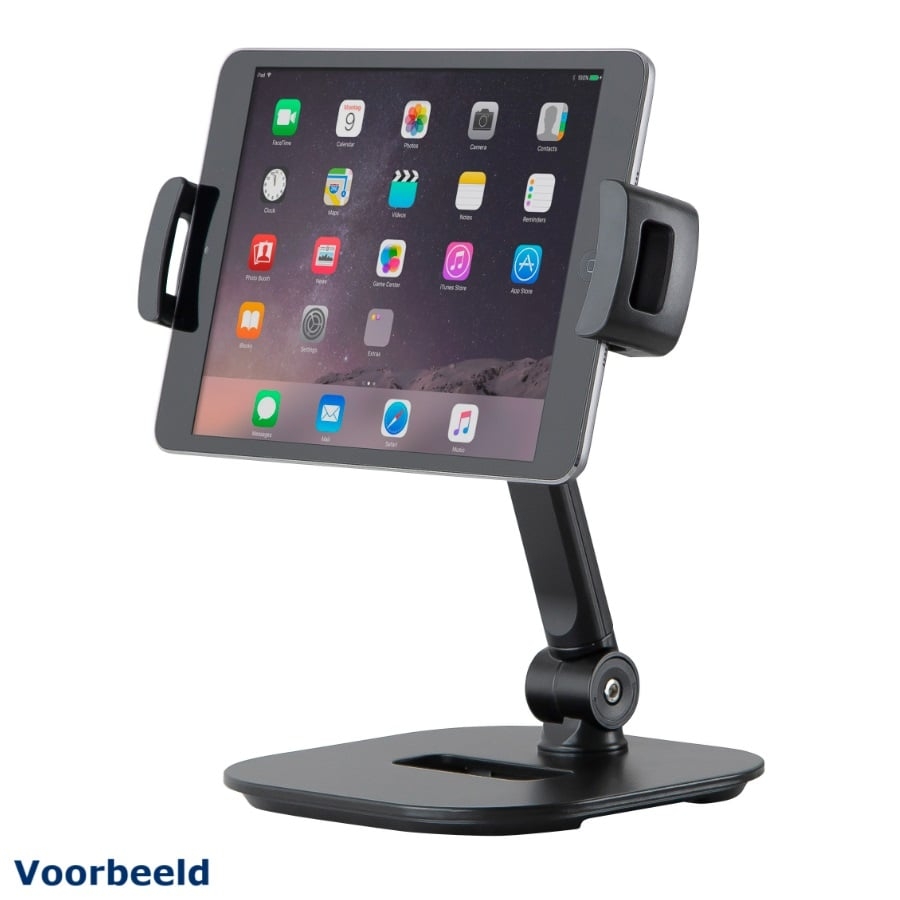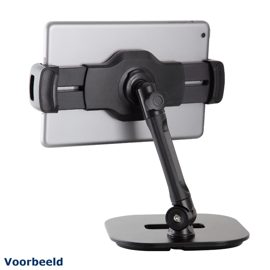 The 19800 is a handy tablet stand from Konig & Meyer. The stand has a sturdy rectangle base so the stand won’t fall over easily. The arm of the stand has two swivel points: one swivel point where the arm and the base meet and a swivel point where the arm and the holder meets. The holder is suitable for tablets between 130 and 224 millimetres. Furthermore, the holder itself has a non-slip coating.