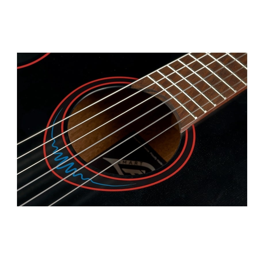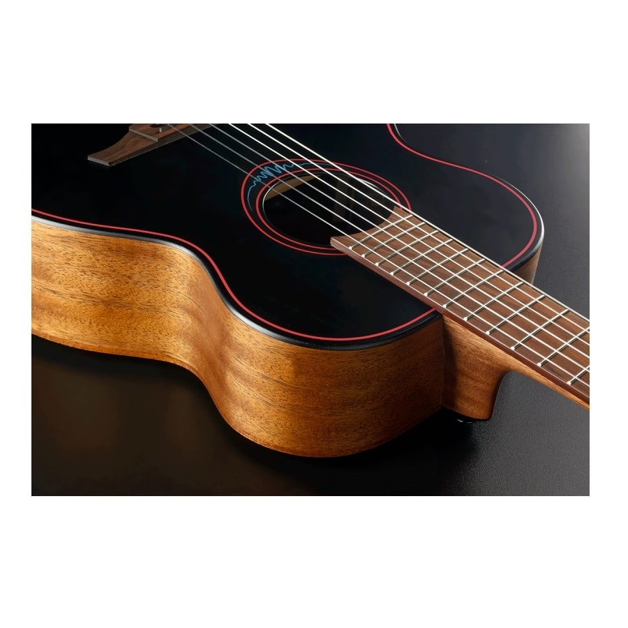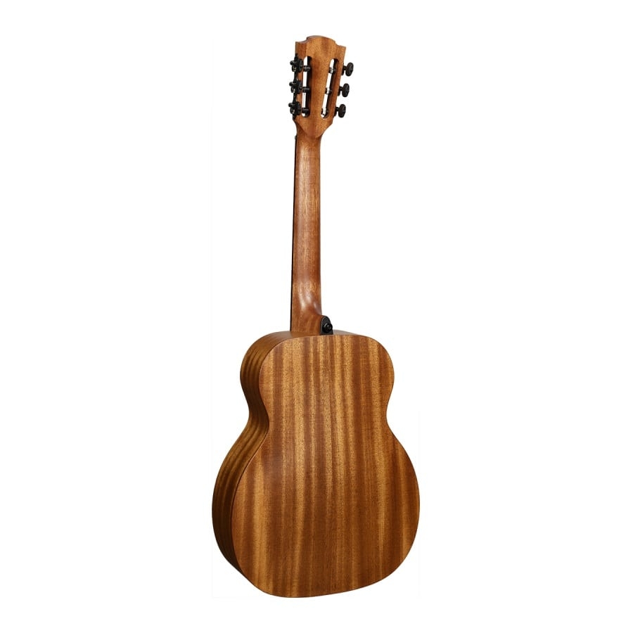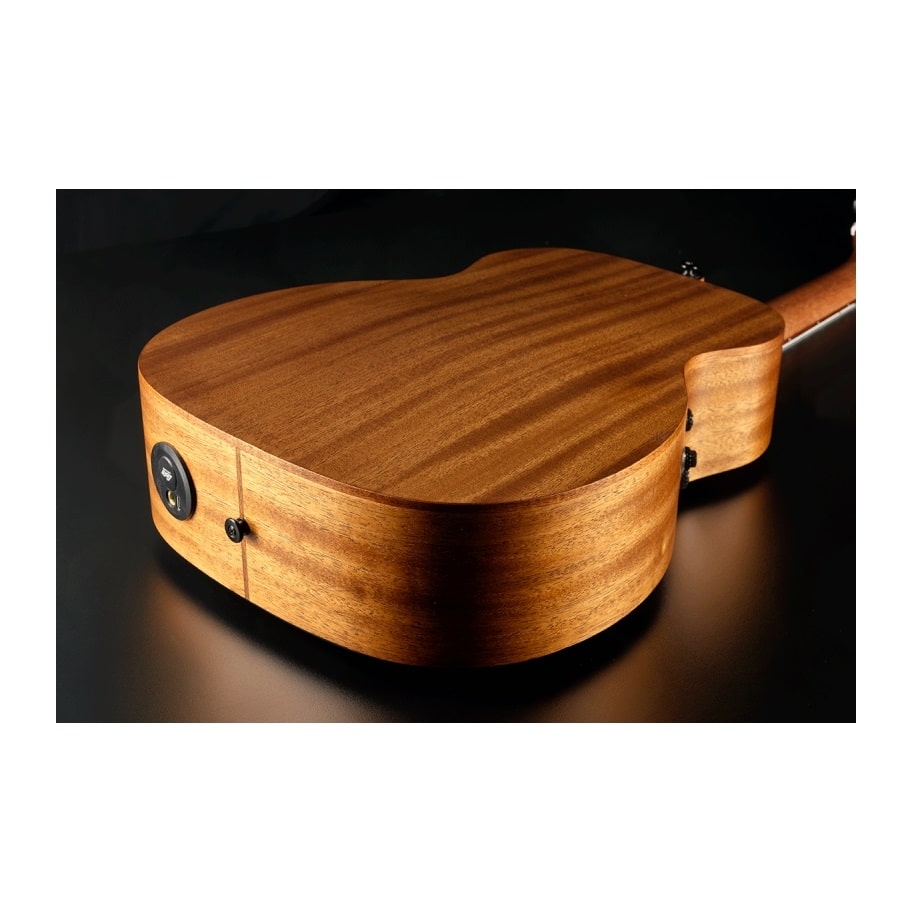 The back and sides are made of laminated khaya. This produces a balanced and bright tone. The top of the guitar is made of solid red cedar. This is a great tonewood that is often used for tops as it produces a beautiful warm sound. The guitar has a khaya neck and a brankowood fretboard for a sustainable and comfortable experience.