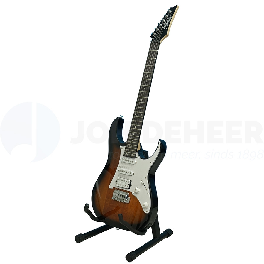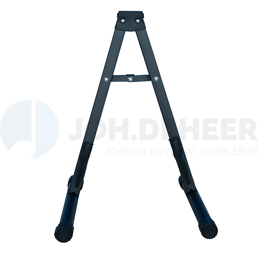 The Ludio GS-10 is an A-shaped guitar stand that is suitable for acoustic guitars, electric guitars and bass guitars. The brackets have a U-shape where the acoustic guitar can be placed in. An extra notch ensures that an electric or bass guitar can also be placed stably in the stand.