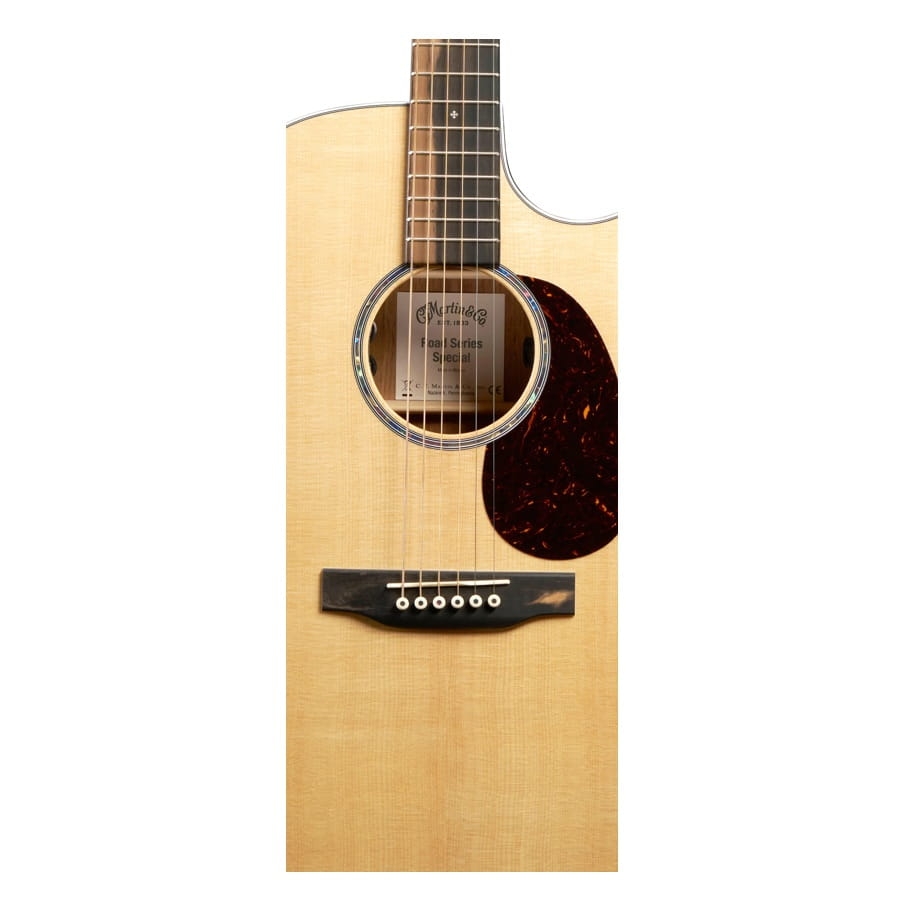 The GPC-13E is a Grand Performance guitar. Grand Performance guitars have a large body which means there’s a lot of space for resonance which will create a full and powerful sound. The GPC-13E Modern has a spruce top. Spruce has a beautiful resonance and produces a warm sound. The back and sides are made of laminated koa. Koa looks beautiful and adds a bright tone and a great resonance to the sound. The guitar has a ‘select hardwood’ neck. This means the neck is either made of cedar or mahogany, depending on which of the two Martin can obtain without having to participate in deforestation. Both tonewoods are great choices for a neck and the difference between the two is minimal. The guitar also has an ebony fretboard, which will provide a smooth playing surface.