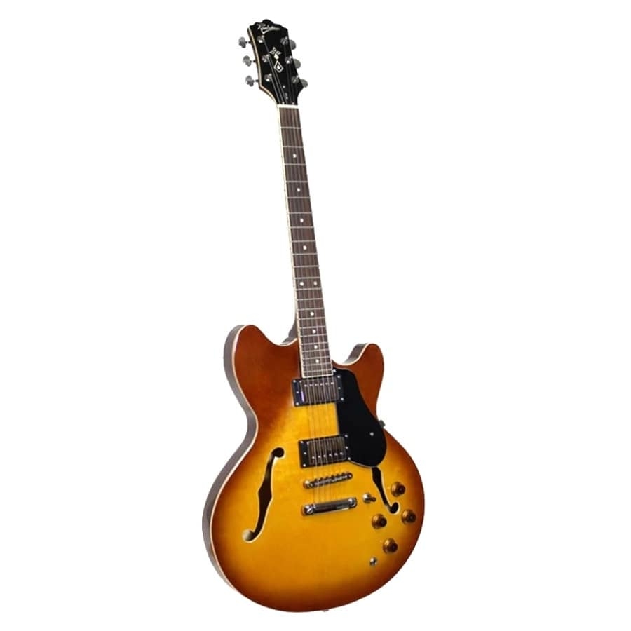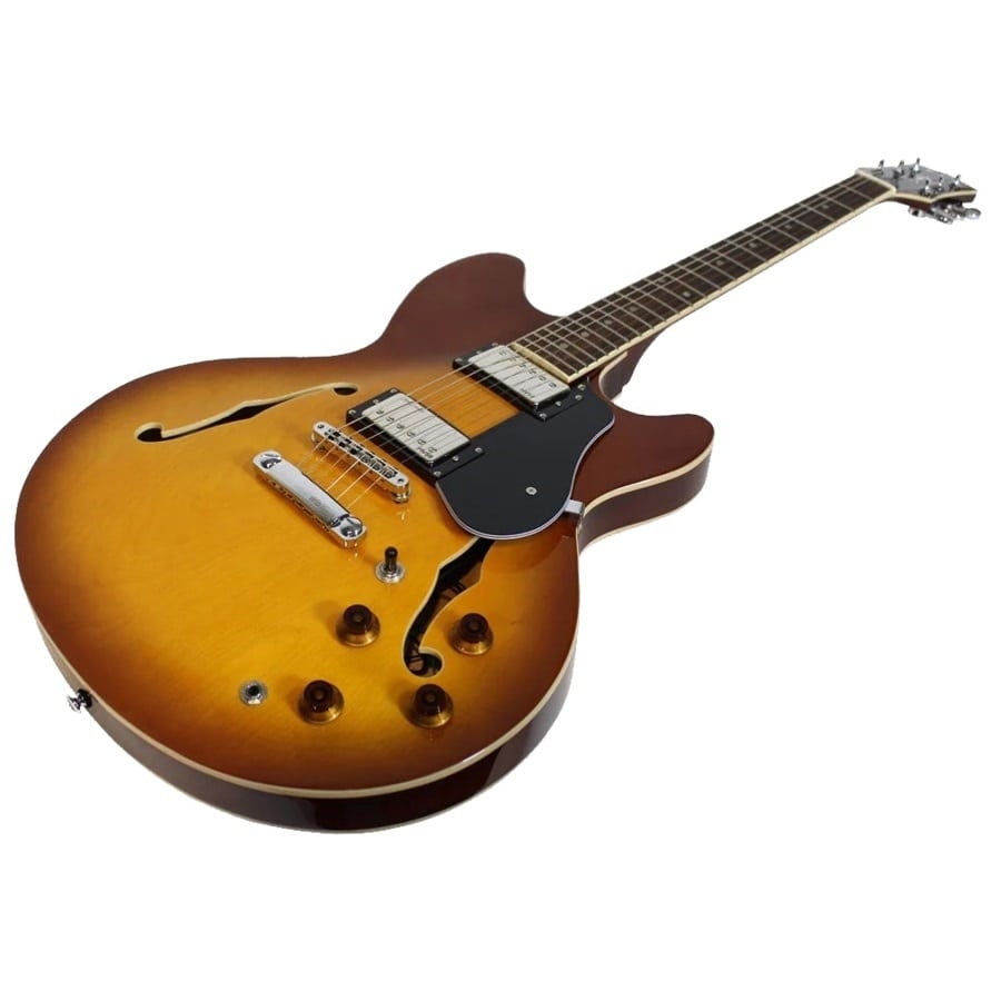 The RT-45 is a great starter guitar from Revelation! Revelation is a British company that produces a wide range of electric guitars and basses with innovative and modern technology for great prices. The RT-45 is a semi-hollow body guitar. This means that the body of the guitar isn’t made of solid wood but it also isn’t completely hollow. A semi-hollow body guitar has hollow compartments in the body. This is an interesting system; the vibrations of the strings will first be caught in the hollow compartments where they’ll resonate and then they’ll be noticed by the pickups. This will result in a unique sound, which will be full and bright with an amazing sustain. The guitar has three Alan Entwistle HV58 humbuckers which will produce a full and hot sound. Furthermore, the guitar is made of sturdy materials. The body is made of mahogany and has a maple top. Mahogany is a great choice as it makes for a sturdy foundation and produces a warm and powerful sound. The maple top is mostly for aesthetics, as it has a beautiful woodgrain which will provide a vintage appearance. The guitar also has a mahogany neck and a Lignum-Rosa fretboard. Mahogany is very popular for guitar necks as it’s sturdy but also feels great. Lignum-Rosa is a relatively new tonewood which is often used as a more sustainable alternative to rosewood. Moreover, the RT-45 has a C-shape neck which is known to be more comfortable and is also suitable for players with smaller hands. You can adjust the pickups with the two volume knobs, the two tone knobs, and the three-way switch.