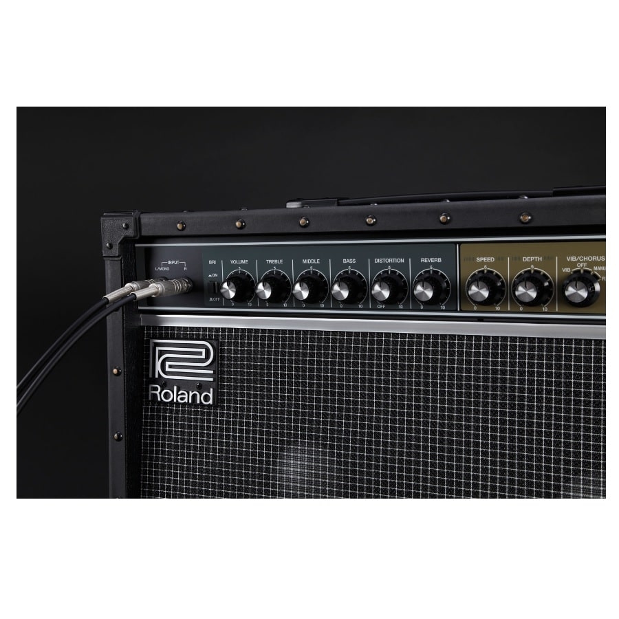 The JC-40 is the result of combining Roland’s famous JC Clean effect and the chorus effect. The amp was modelled after the JC-120 and has the same classic stereo sound that is perfect to be used together with effect pedals. Do you need a stereo input? No problem! The amp has a proper stereo input so you can combine it with stereo effects, guitar synthesizers, and multi-effects. Furthermore, the amp has the Dimensional Space Chorus effect built in for beautiful and full sound. Additionally, the amp has other built-in effects, like vibrato, distortion, and reverb.