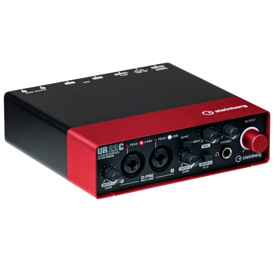 The UR22C is a great interface from Steinberg. Steinberg is a German company that produces high-quality audio products. They are mostly known for their DAW: Cubase. However, they also produce high-quality interfaces. The UR22C is a compact and handy interface. The device has two microphone inputs and two instrument inputs. However, the two microphone inputs share the inputs with the instrument inputs, meaning you can only use two inputs at the same time. Both inputs have their own separate volume knob and for input 2 you have a separate button if you want the input to be HI-Z. The interface also has a stereo output and a MIDI in and out. You can also listen to your audio with headphones. The UR22C has two separate volume knobs for the headphones and the stereo output. Furthermore, you can connect the UR22C to your computer with the included USB cable. If your device doesn’t have enough phantom power, the interface also has a separate input for an additional power source. Additionally, Cubase AI and Cubasis LE are included with your purchase. Cubase AI is a scaled-back version of the famous Cubase Pro, and Cubasis LE is specifically designed for recording and mixing on your iPhone or iPad. Moreover, dspMixFX and FX Basic Suite are also included. The UR22C produces high-quality audio, with 32-bit/192 kHz resolution, and is versatile in its use. As such, you can record music, but it’s also suitable as an audio interface for visual media. This makes the interface also popular for content creators and podcasters.