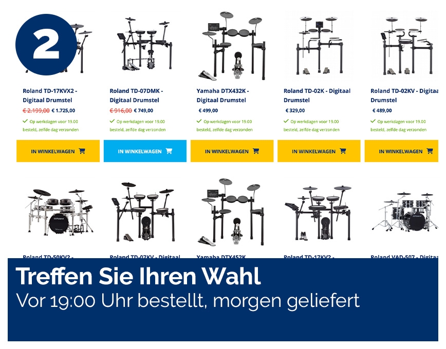 Willkommen in der Schlagzeugabteilung von Joh.deHeer Musik! In unserem Showroom und auf unserer Website finden Sie eine große Auswahl an digitalen Drum Sets, Percussion und allem erdenklichen Zubehör. Wir verkaufen Drum Sets von bekannten Marken wie Roland und Yamaha. In unserem 2500m2 großen Showroom sind fast alle Modelle vorführfertig und unsere Spezialisten beraten Sie gerne. Nach der Bestellung können Sie das Schlagzeug oder Zubehör oft gleich mitnehmen oder wir versenden es noch am selben Tag!