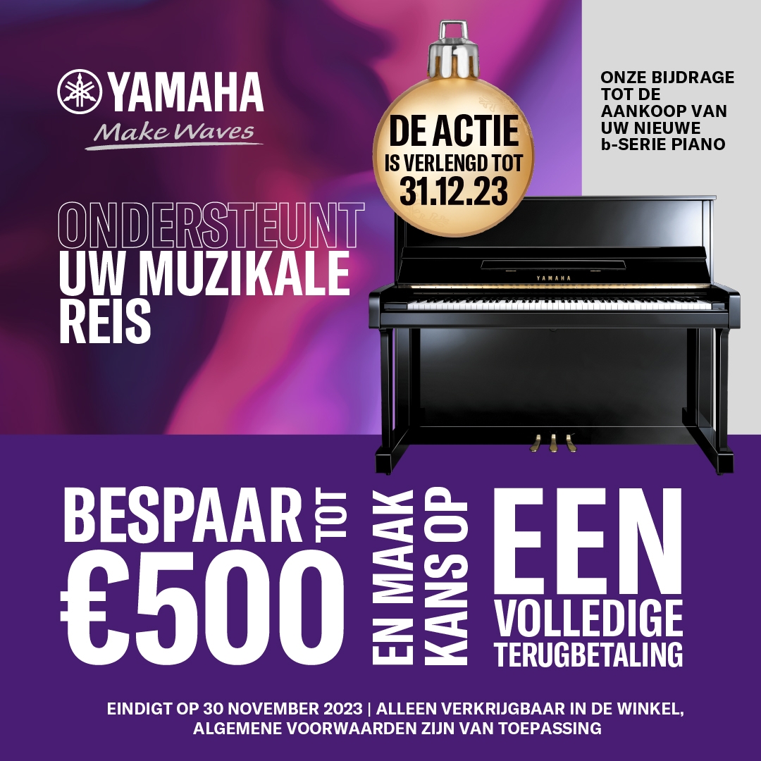De zomervakantie is achter de rug en het nieuwe muziekseizoen staat weer voor de deur. Muziekdocenten openen weer hun lespraktijken en zo kan het zomaar zijn dat u of uw kinderen weer gaan starten met muziekles. Yamaha ondersteunt uw muzikale reis! Bespaar tot 500,00 op uw aankoop van een Yamaha B-Piano en maak hierbij ook nog kans op een volledige terugbetaling. De actieperiode loopt van 1 september tot 31 december.